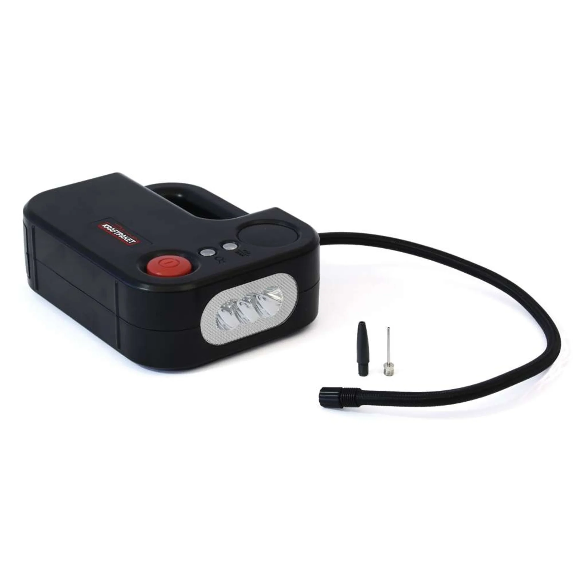 Le concentré de puissance Dino, puissance de 120 watts, pression maximale de 10 bars et débit de 22 litres par minute permet de gonfler les pneus de voiture, les matelas pneumatiques et les ballons. Le compresseur prend environ 4 minutes pour un pneu 195/50 R15 de 0,0 à 2,0 bars. Le tuyau de pression d'air a une longueur d'environ 52 cm. Le câble d'alimentation de 2,7 mètres permet de le brancher sur des prises de 12 volts ou sur l'allume-cigare. Le tuyau de pression d'air, le câble d'alimentation et l'adaptateur peuvent être rangés dans l'appareil.