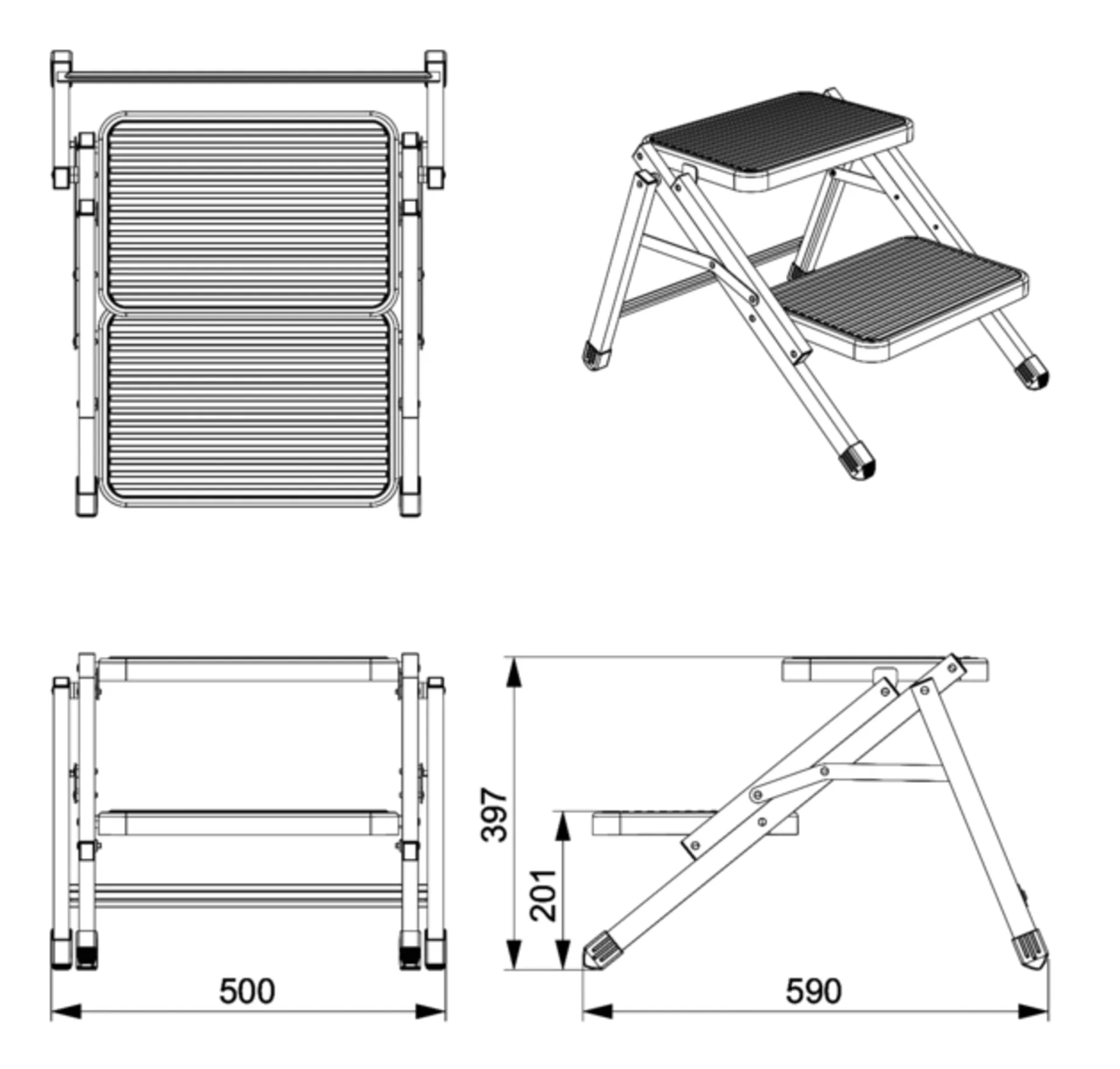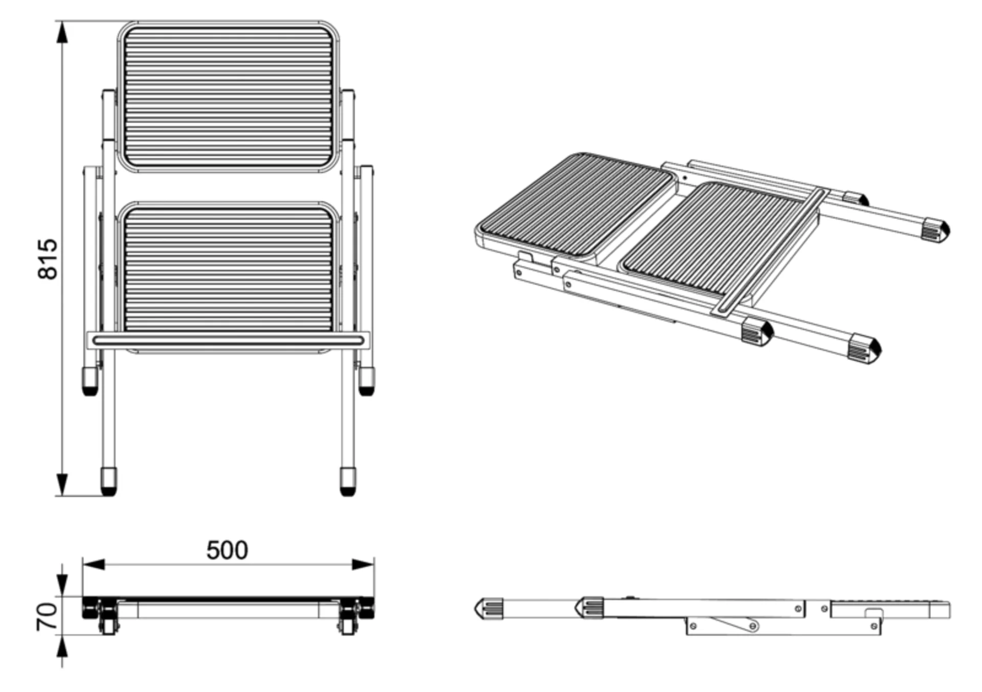 Klappbare Doppeltrittstufe, aus Stahl mit Antirutschbeschichtung.