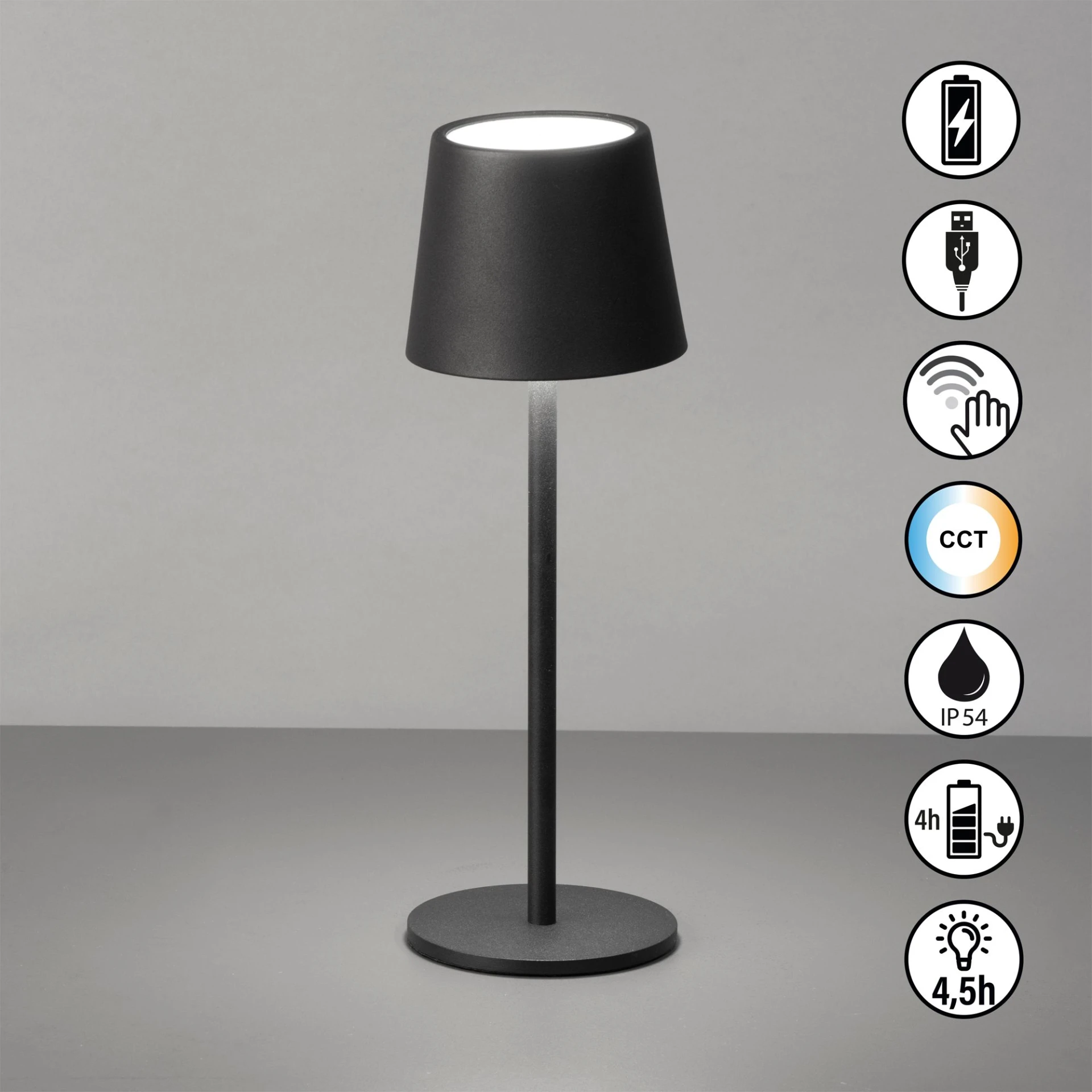 Die Easy Akku-Tischleuchte Roxi vereint stilvolles Design mit hoher Funktionalität. Perfekt für den flexiblen Einsatz drinnen und draußen, bietet sie stimmungsvolles Licht und ist dank Akku kabellos nutzbar.