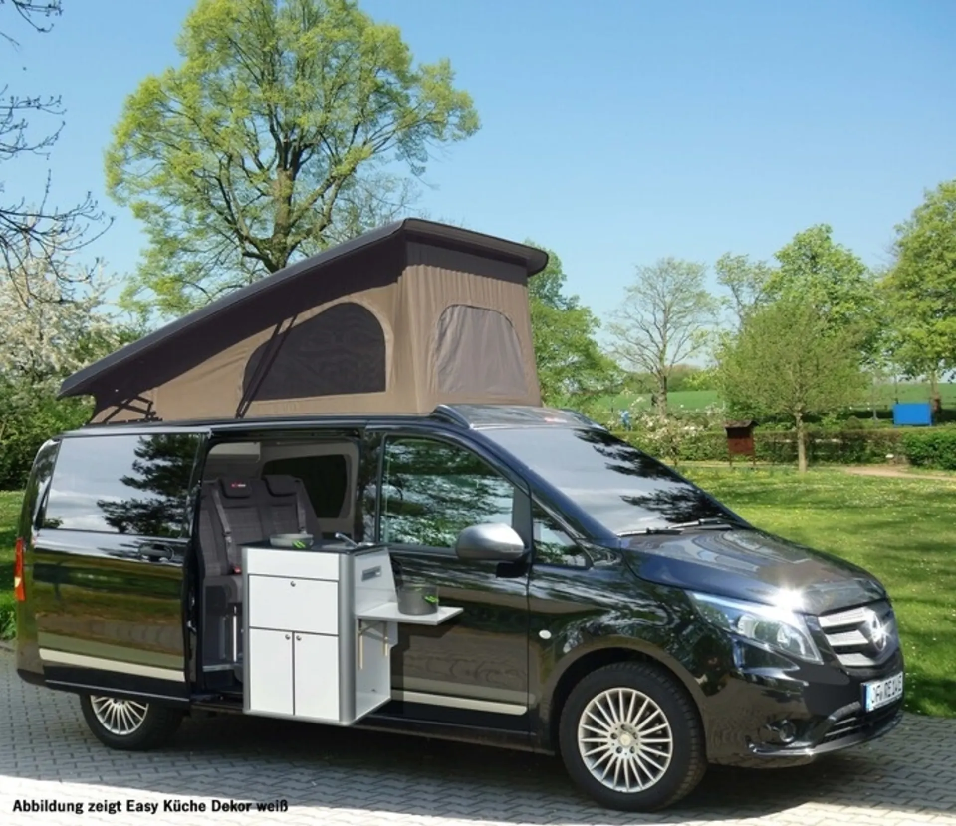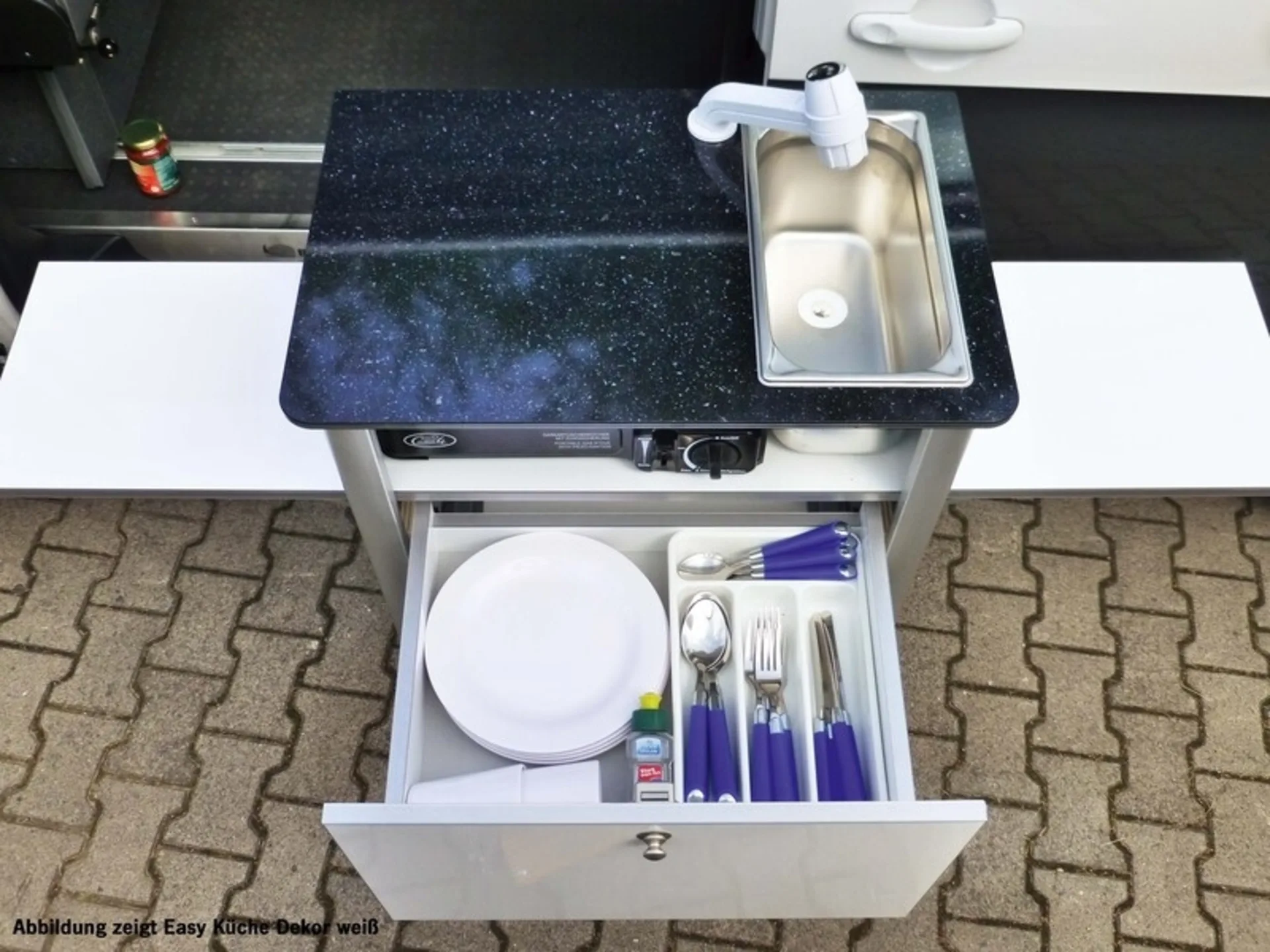 Elément de cuisine noir mat à installer à droite derrière les sièges de la cabine conducteur dans le combi/caravelle VW T5/T6 en combinaison avec une banquette-lit Reimo V3000 (ne convient pas au Multivan et au California Beach). La cuisine Easy peut également être installée dans un Mercedes Vito (break long). La partie cuisine peut pivoter vers l'extérieur avec une ferrure pivotante en option. Un évier en acier inoxydable et un système d'eau sont également installés. Avec l'élément de cuisine Easy, tu peux cuisiner confortablement en dehors du véhicule. Au quotidien, l'élément de cuisine peut être stocké à la maison dans la cave ou le grenier. La partie cuisine est livrée pré-assemblée avec la technique intégrée, y compris le matériel de fixation pour les rails de sol Reimo.