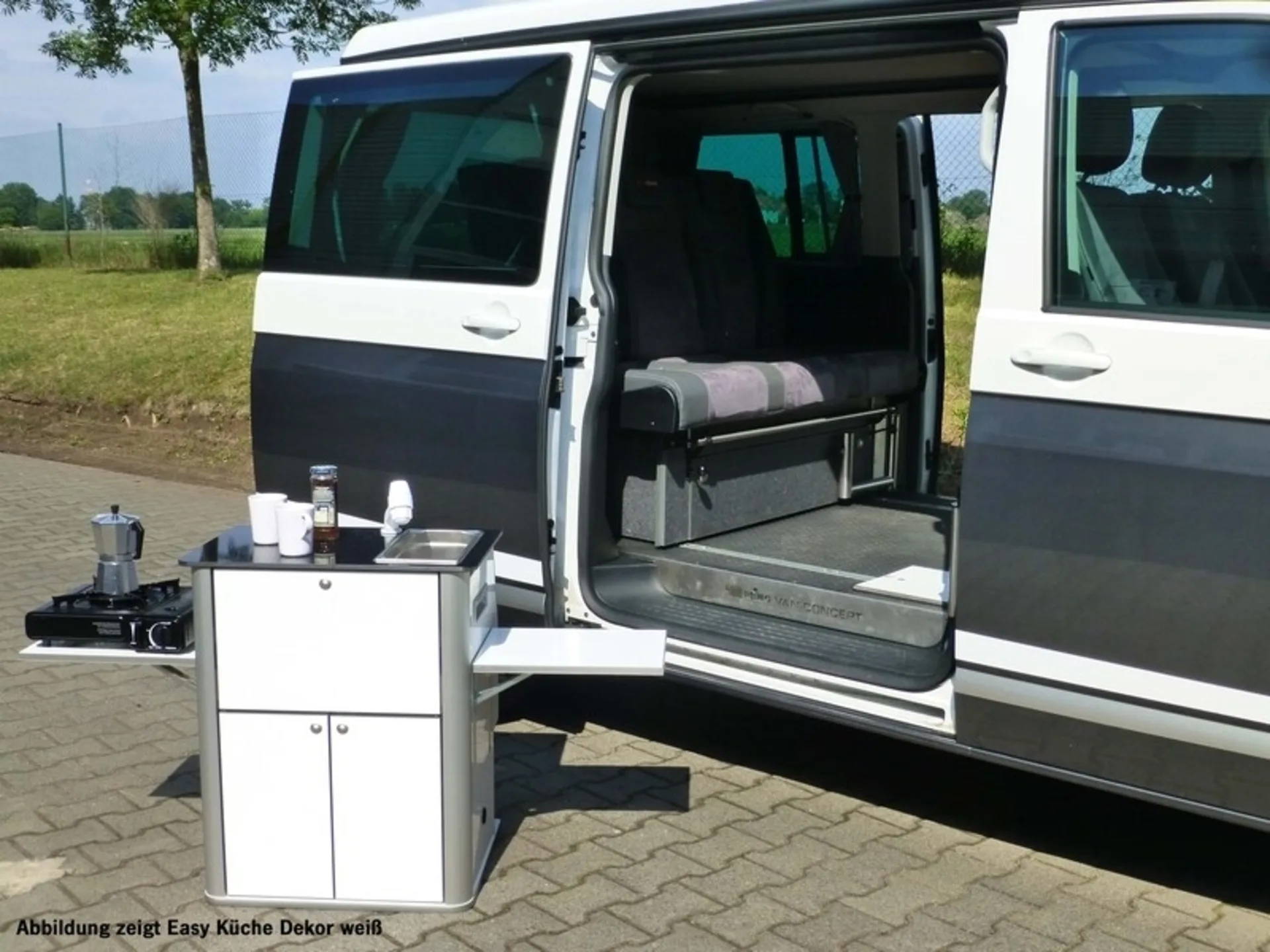Elément de cuisine noir mat à installer à gauche derrière les sièges de la cabine conducteur dans le combi/caravelle VW T5/T6 en combinaison avec une banquette-lit Reimo V3000 (ne convient pas au Multivan et California Beach). La cuisine Easy peut également être installée dans un Mercedes Vito (break long). La partie cuisine peut pivoter vers l'extérieur avec une ferrure pivotante en option. Un évier en acier inoxydable et un système d'eau sont également installés. Avec l'élément de cuisine Easy, tu peux cuisiner confortablement en dehors du véhicule. Au quotidien, l'élément de cuisine peut être stocké à la maison dans la cave ou le grenier. La partie cuisine est livrée pré-assemblée avec la technique intégrée, y compris le matériel de fixation pour les rails de sol Reimo.