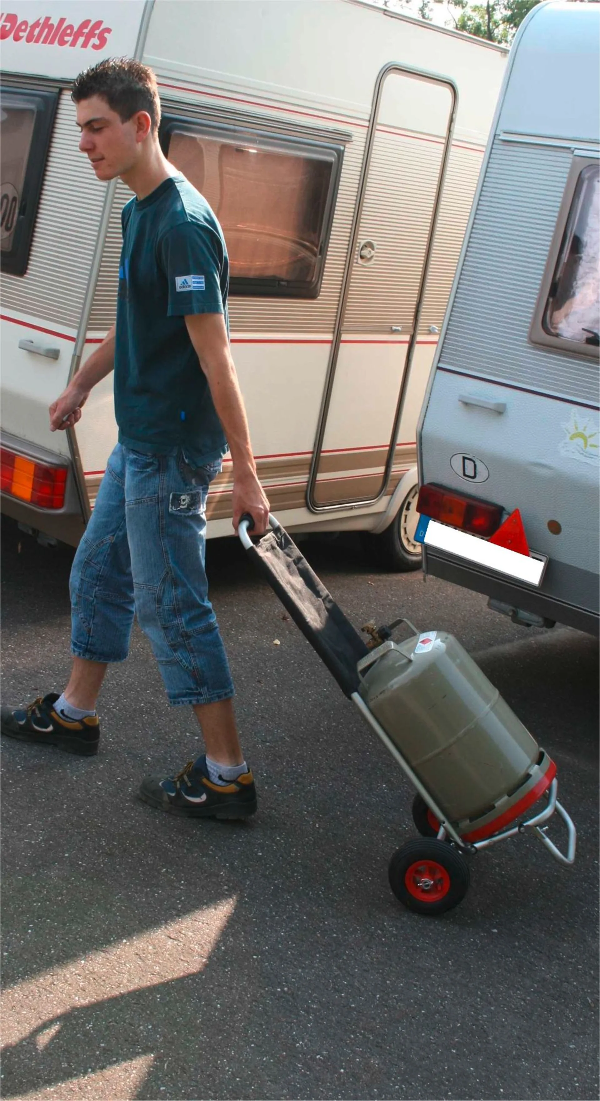 Der ECKLA-CAMPINGBOY wurde speziell für den schweren Campingeinsatz entwickelt. Die Abmessung ist an die dort verwendeten Gasflaschen, Wasserbehältnisse und an die WC Kassetten angepasst. Die Kassetten werden ohne festspannen einfach nur eingelegt genau so die Gasflaschen (11kg Ø 300mm). Es wird für passenden Sitz von Cassette und Gasflasche nur die hintere Bespannung hochgeschoben. Für alle weiteren Transportgüter wie Wasser- und Abwassertanks oder bei der Benutzung als Einkaufswagen bleibt die Bespannung unten.