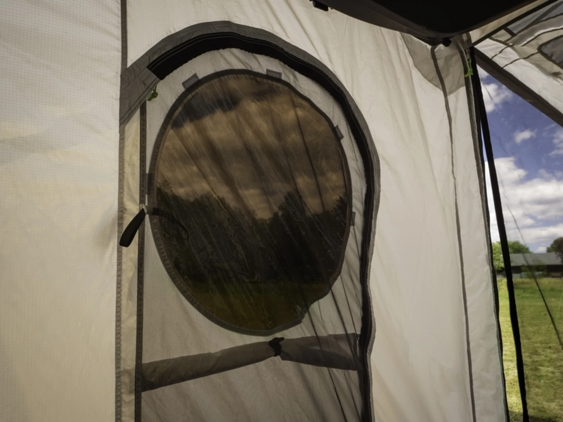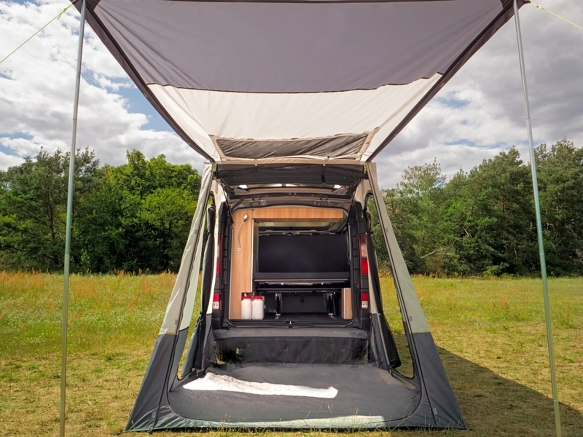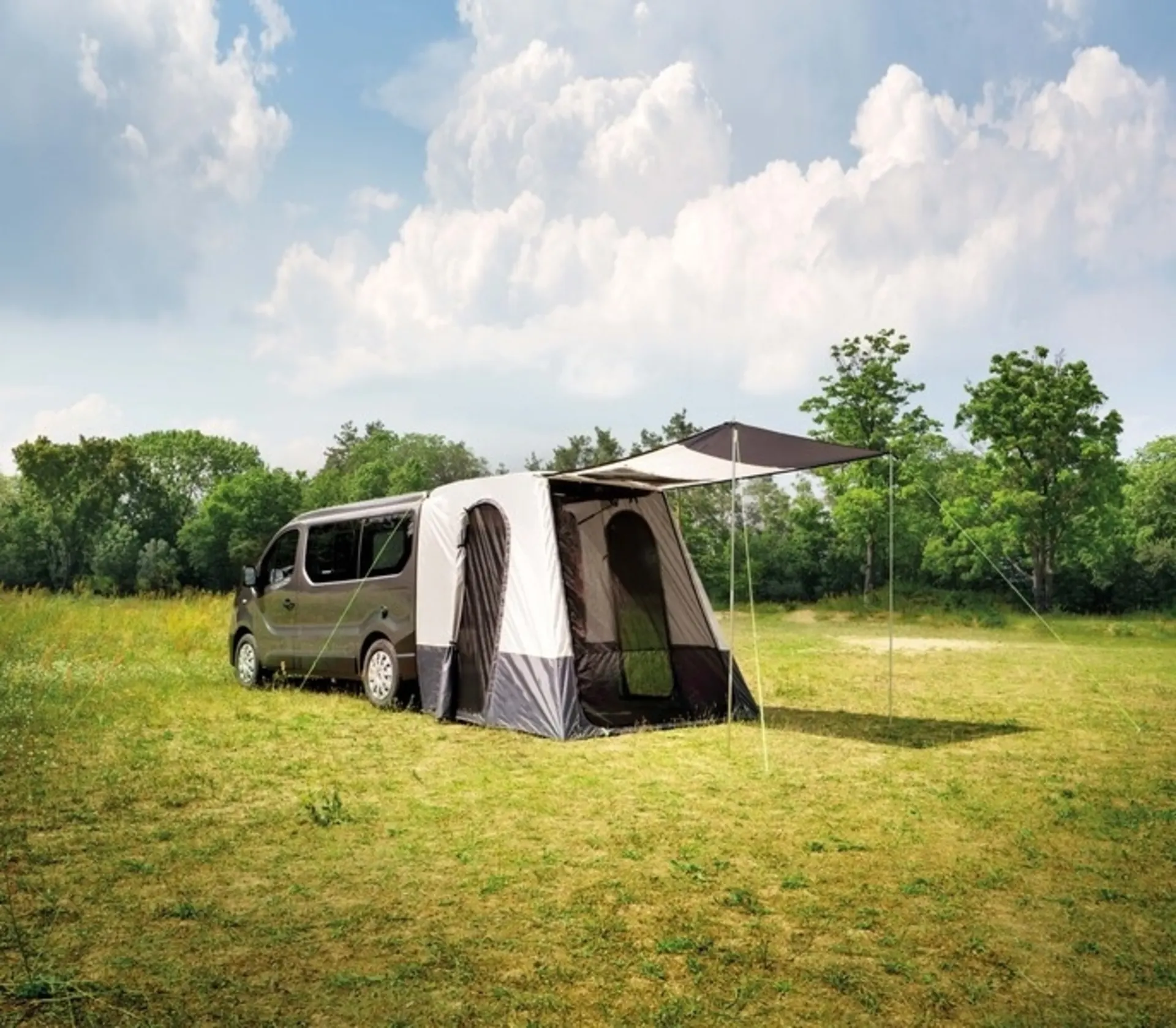 Pas d'armature, faible encombrement, poids léger et montage facile font de la "TRAPEZ PREMIUM" la tente arrière parfaite. Les nouvelles caractéristiques d'équipement comme la moustiquaire dans toutes les portes zippées, la jupe vers le pare-chocs et le bac de sol cousu offrent un confort supplémentaire. La porte avant a une fenêtre supplémentaire avec moustiquaire et peut également être utilisée comme auvent. Les deux entrées latérales ont des fenêtres teintées avec couverture. Le best-seller avec protection contre les moustiques et les insectes a une aération supplémentaire au-dessus de l'entrée et peut être fixé avec des clips sur le côté du véhicule. Le bac de sol cousu peut être fixé au pare-chocs avec du velcro. La fenêtre dans le toit reste utilisable comme lanterneau.