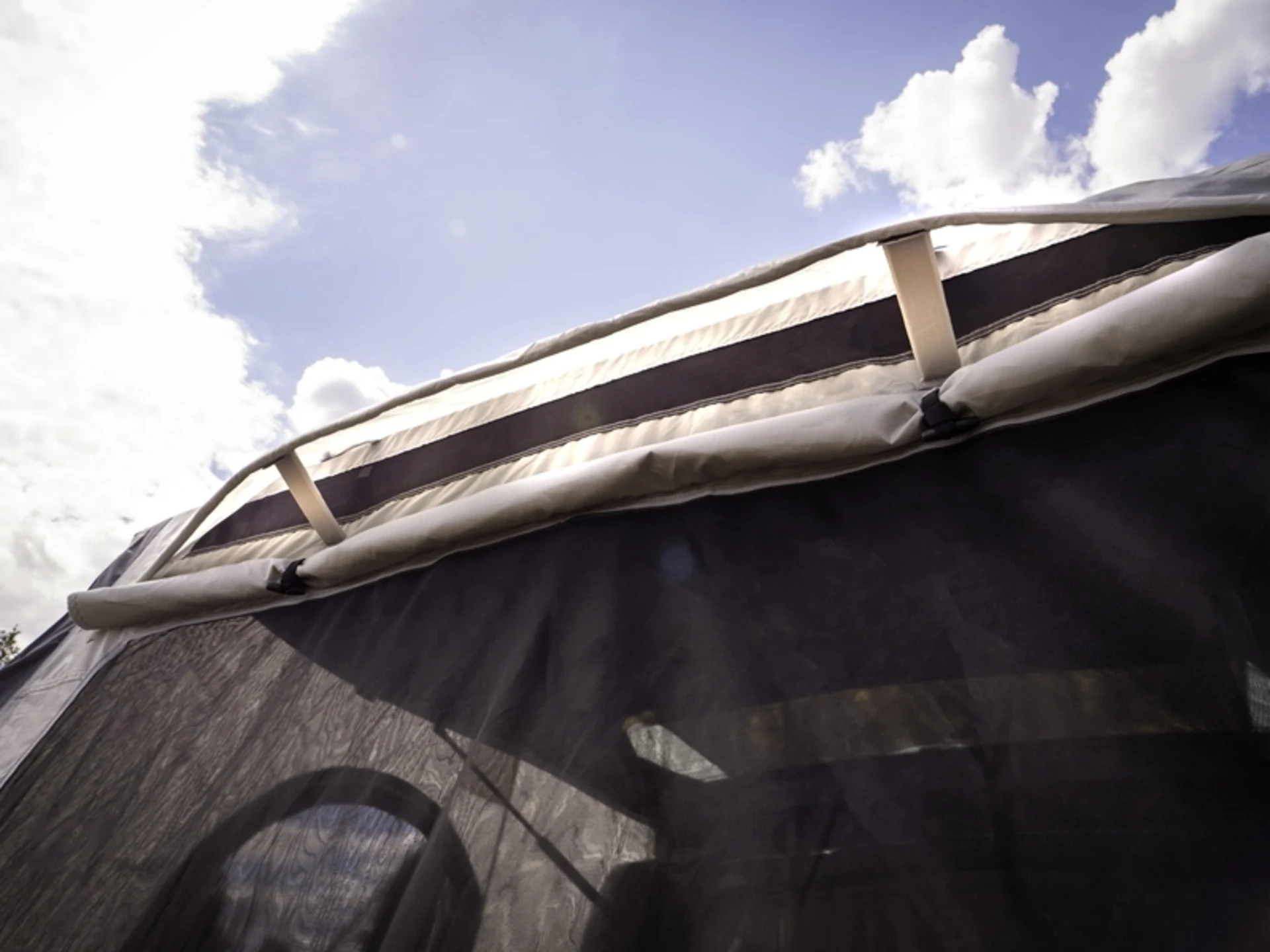 Il suffit de tirer la tente arrière par-dessus le hayon ouvert et de la fixer ensuite au véhicule et au sol.