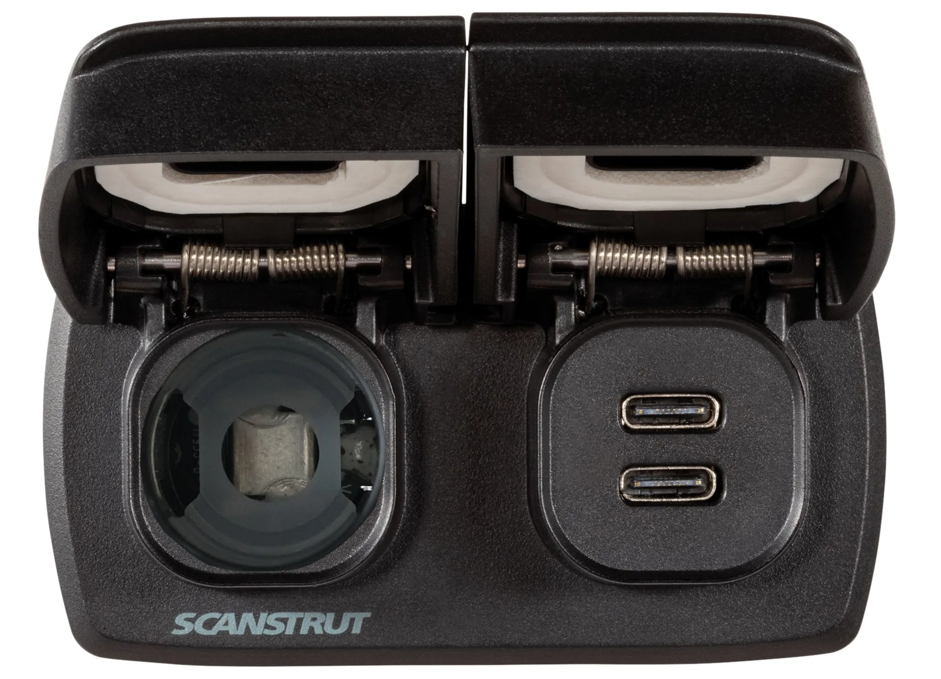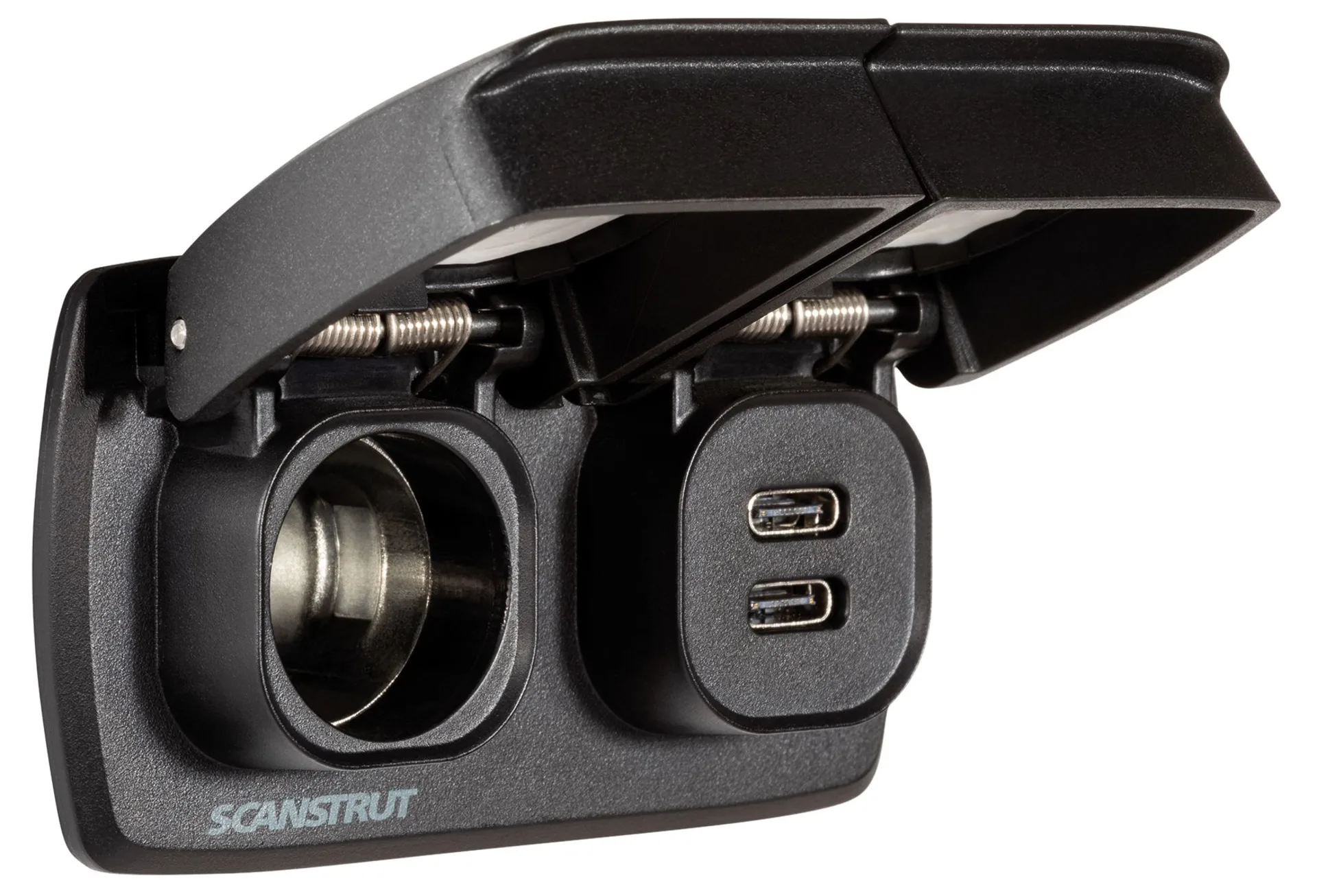 Kombiniert die Eigenschaften unserer Scanstrut Hochleistungssteckdosen Flip Pro Max und 12 V in einer schönen Multi-Power-Lösung.