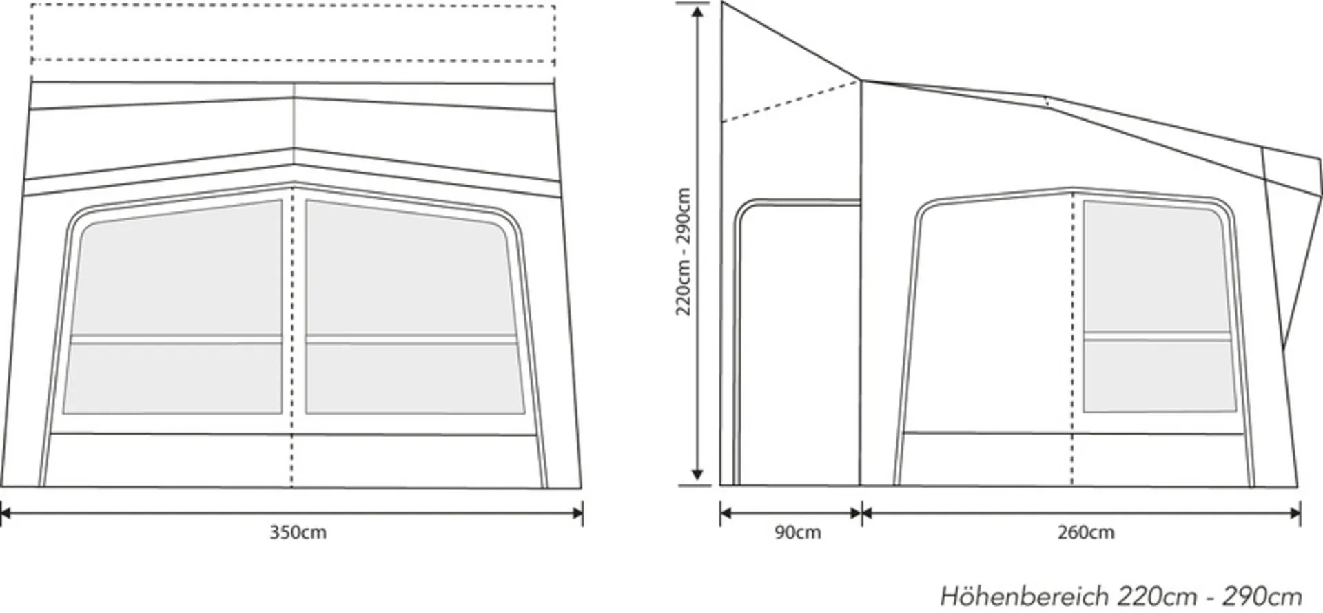 - Dimensions L 350cm P 260cm + 90cm sas H 220-290cm