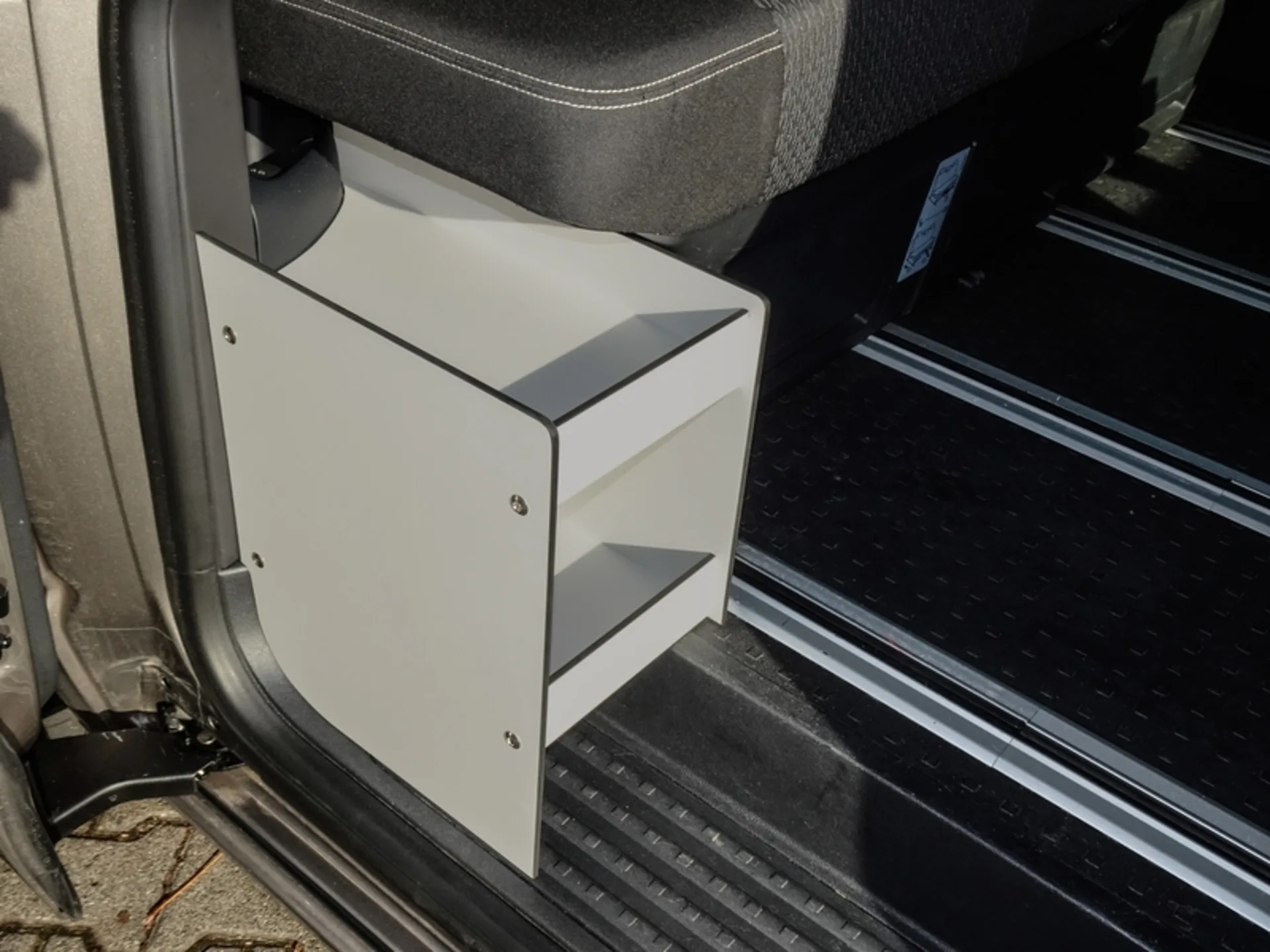 Étagère utile en HPL résistant aux intempéries pour un espace de rangement supplémentaire à côté de la banquette (par exemple pour le téléphone portable, les lunettes, les jouets). Fixation à l'aide de bandes velcro, sans modification sur le véhicule. Livré démonté à monter soi-même (effort d'environ 15 minutes).