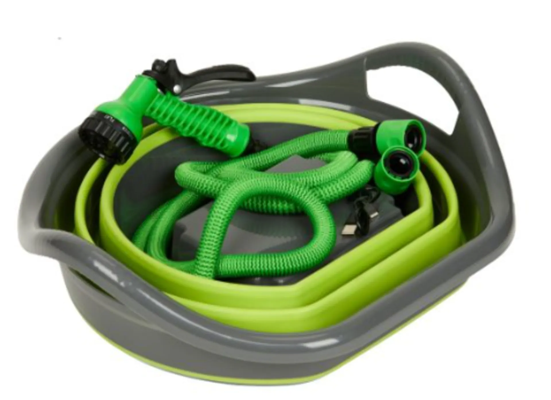 Die Lieferung erfolgt inkl. dehnbarem Wasserschlauch (max. 6 m), einstellbarer Spritze (7 Strahlarten) mit Pistolengriff und entsprechendem USB-Ladekabel inkl. Ladeanzeige.