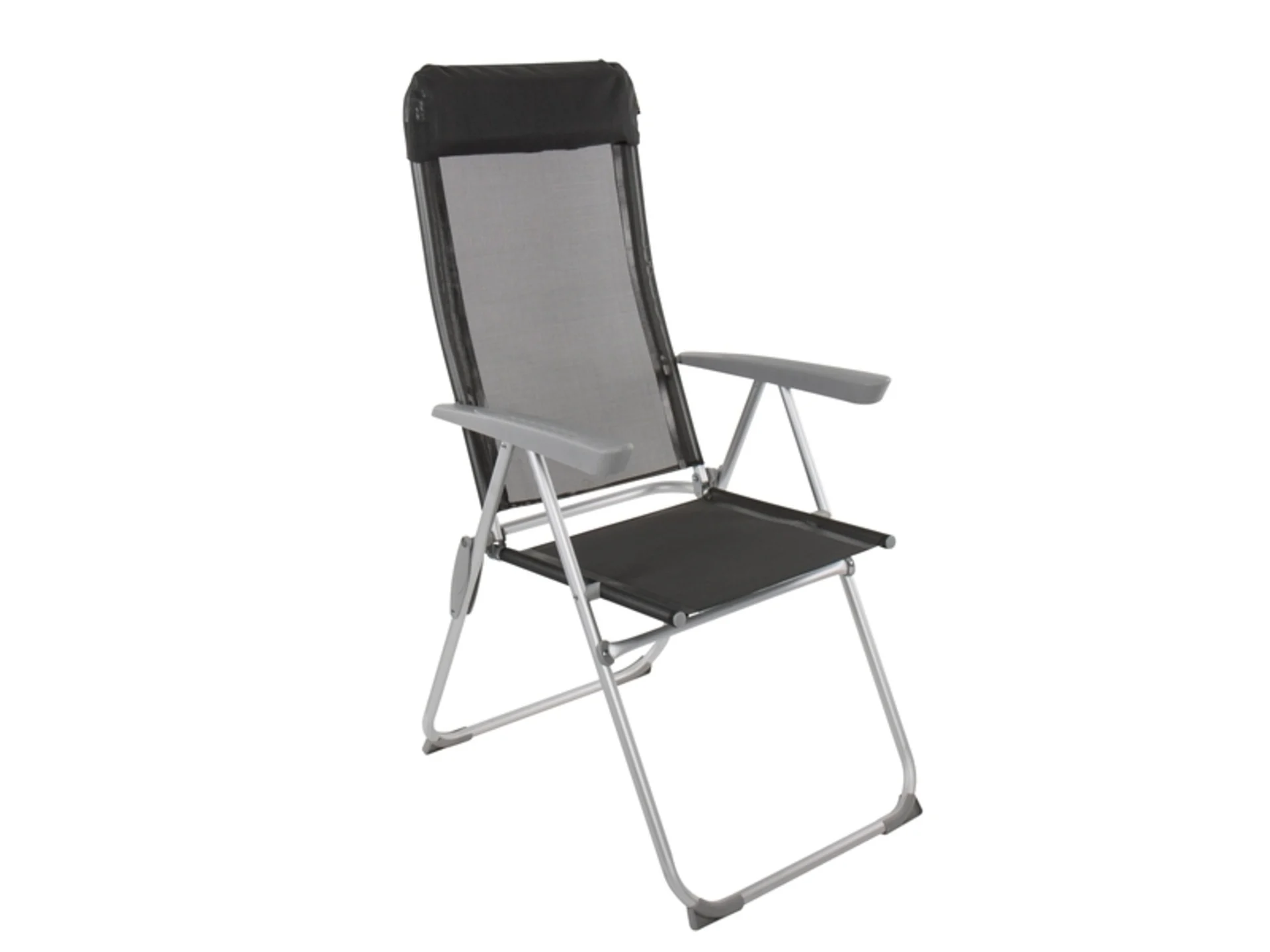 Chaise de camping confortable avec un dossier réglable sur 5 positions, un coussin pour la tête et une structure solide en aluminium.