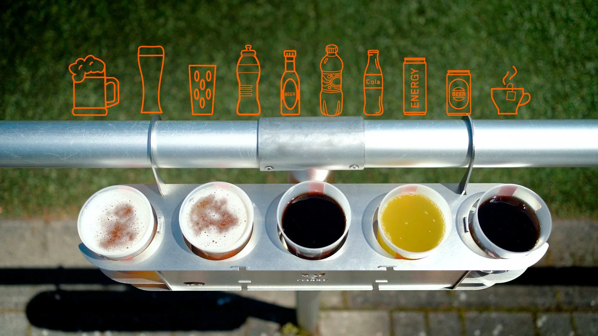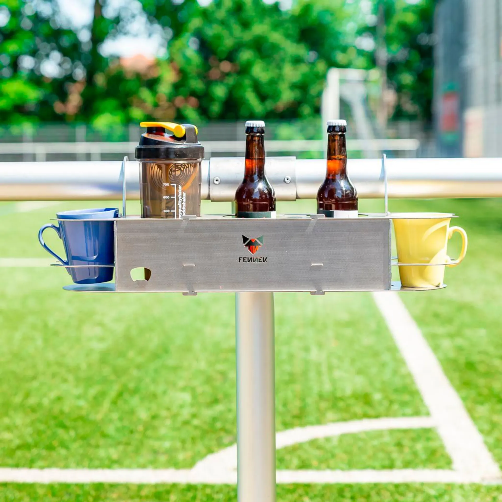 Mit dem integrierten Flaschenöffner öffnest du Flaschen immer ganz frisch und hast eine Sorge weniger.Die verschiedensten Flaschen, Dosen, Gläser und sogar Tassen in unterschiedlichen Größen und Formen können in die Halterung gestellt werden. Perfekt also für den Fußballplatz oder den Tennis-Court.