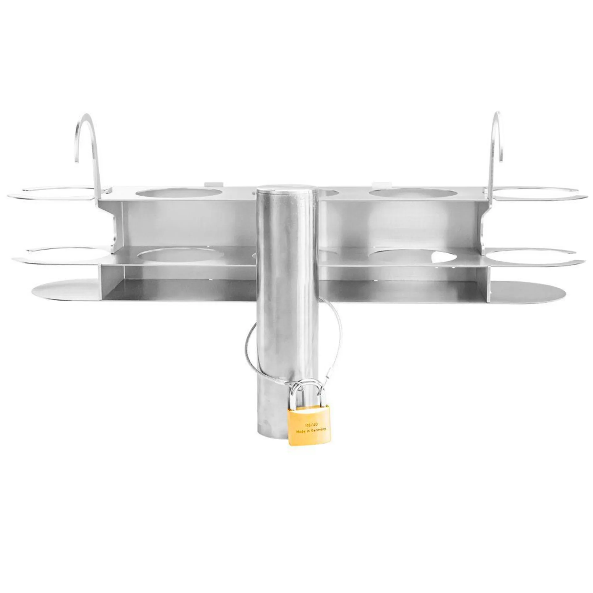 Der Getränkehalter besteht vollständig aus Edelstahl, wird zusammengesteckt und trotzt Wind und Wetter. Die durchdachte Sicherung, verhindert unerlaubtes Entfernen indem der Getränkehalter mit einem Stahlkabel und einem Schloss abgeschlossen werden kann. (Das Schloss ist nicht im Lieferumfang enthalten!)