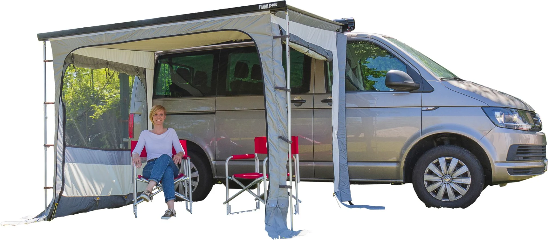 Contenu de la livraison: Auvent complet composé d'un toit, de parois frontales et latérales d'une seule pièce, rideaux pour la fenêtre de la partie frontale, kit de montage pour stores Fiamma, kit d'ailerons transversaux pour le soutien, kit de sangles et de piquets, sac de transport.