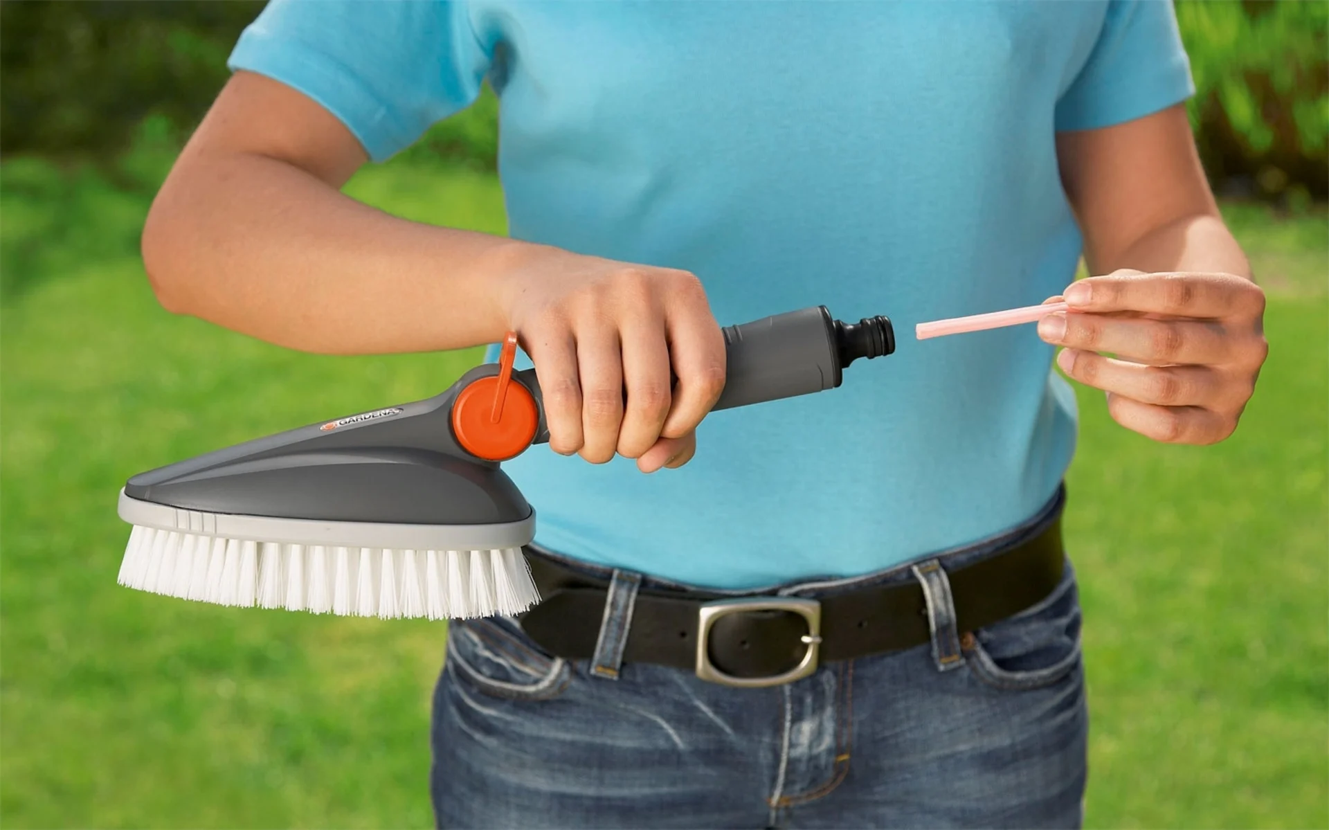 Der Handschrubber kann bequem und einhändig bedient werden und ist aufgrund seiner schmalen und flachen Form auch für enge Stellen geeignet. Die umlaufende Weichkunststoffleiste verhindert Kratzspuren. Mit der Beimischung von Gardena Seifenstäbchen wird die Reinigungswirkung noch verstärkt. Diese Bürste ist nicht kompatibel mit den Gardena Wasserstielen.