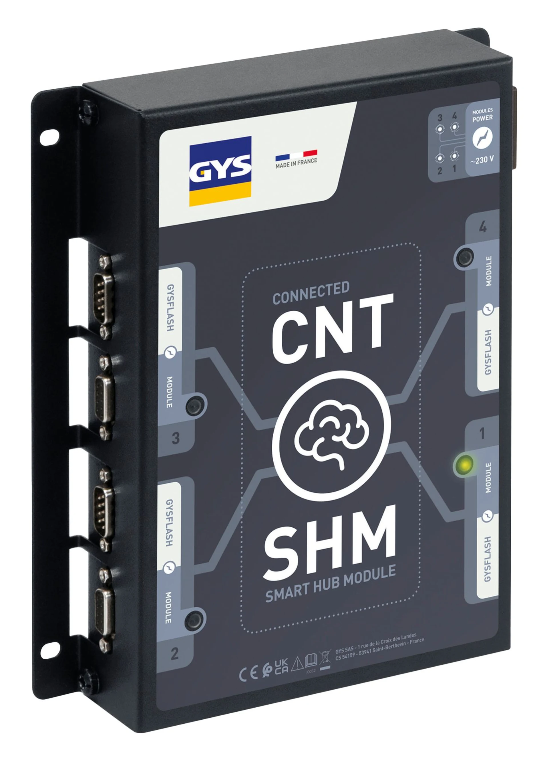 Das Smart Hub Modul (SHM) ist das unverzichtbare Zubehör für ein GYSFLASH CNT, damit es mit seiner Umgebung kommunizieren kann. Funktionsumfang :