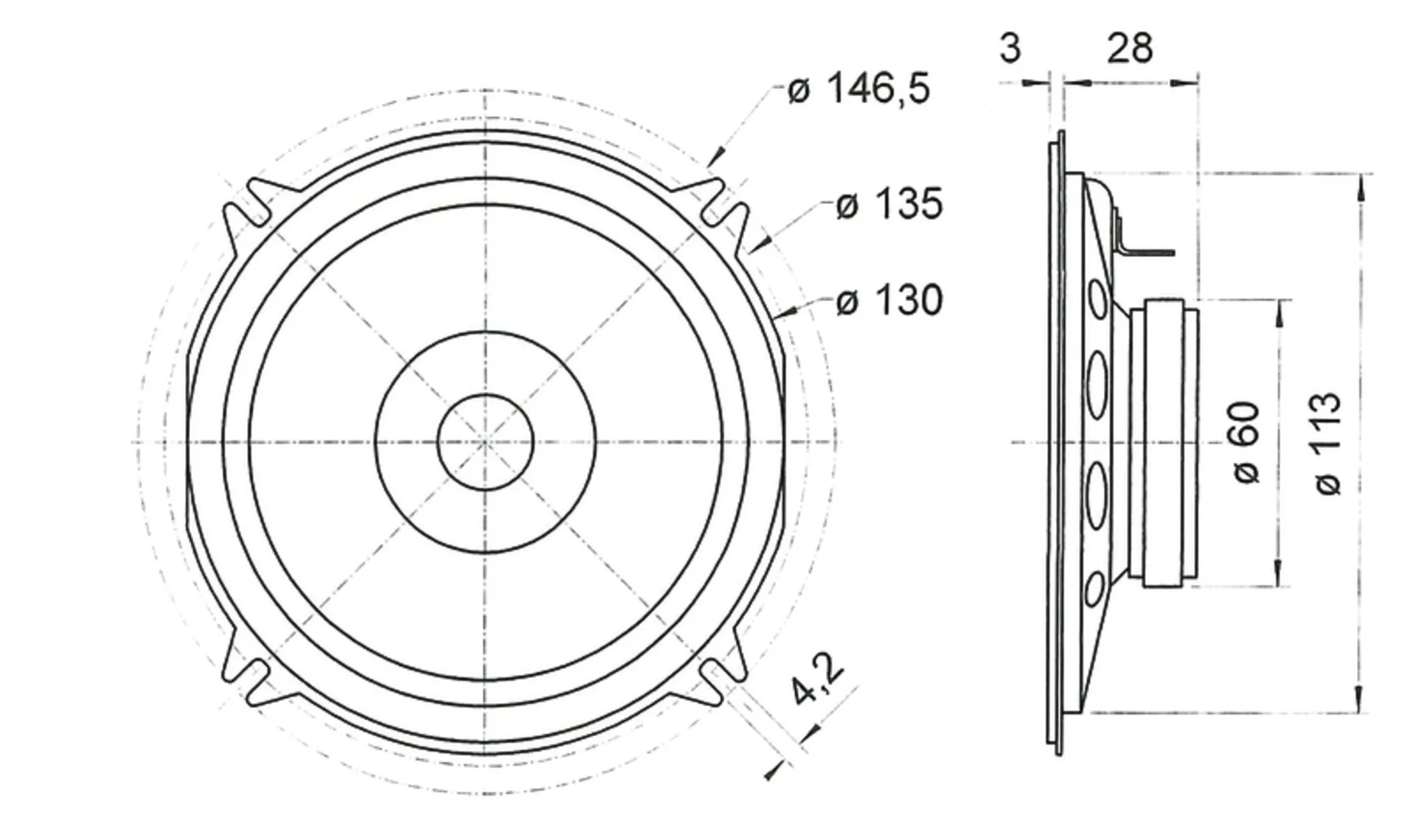 Forme particulièrement plate (28mm seulement), donc utilisable partout où l'espace est limité.Possibilités d'application : Haut-parleurs encastrés dans les voitures, les bus ou les véhicules ferroviaires, instruments de musique électroniques,haut-parleurs de contrôle dans les appareils électriques.Option:Grille de protection pour FR 12, article n° 49809
