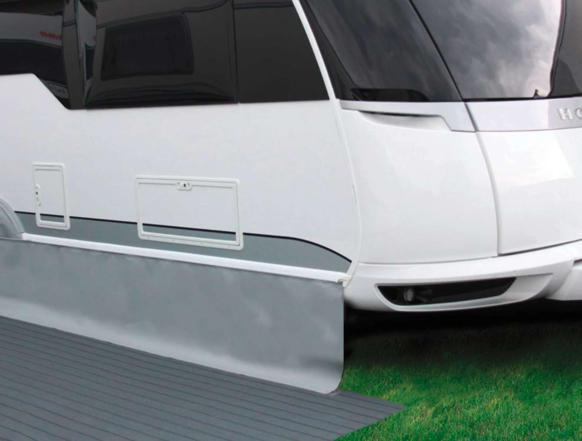 Ob mit oder ohne Vorzelt, die Hindermann Bodenschürze ist ein willkommener Schutz vor Zugluft am Sitzplatz vor dem Wohnwagen und blockiert unangenehmen Wind. Ideal auch für die dauerhafte Montage dank Keder und Ösen zur Bodenbefestigung. Aus winterfestem und gewebeverstärktem Planenmaterial mit Textilkeder.
