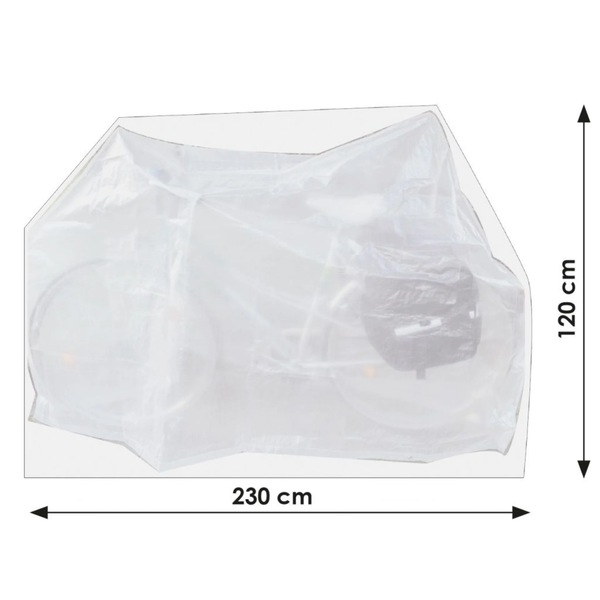 La housse résistante aux intempéries est fabriquée en tissu de polyéthylène et protège contre toutes les intempéries et la poussière. La structure de ce matériau garantit une grande flexibilité tout en supportant une charge maximale. Avec des œillets pratiques pour une fixation facile. La housse de protection est adaptée à une utilisation de 15 °C à 40 °C dans un endroit sec. Stabilisé aux UV, transparent, indéchirable &, résistant aux intempéries. Convient pour un vélo.