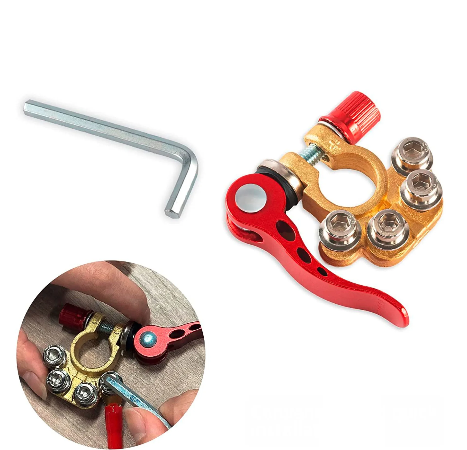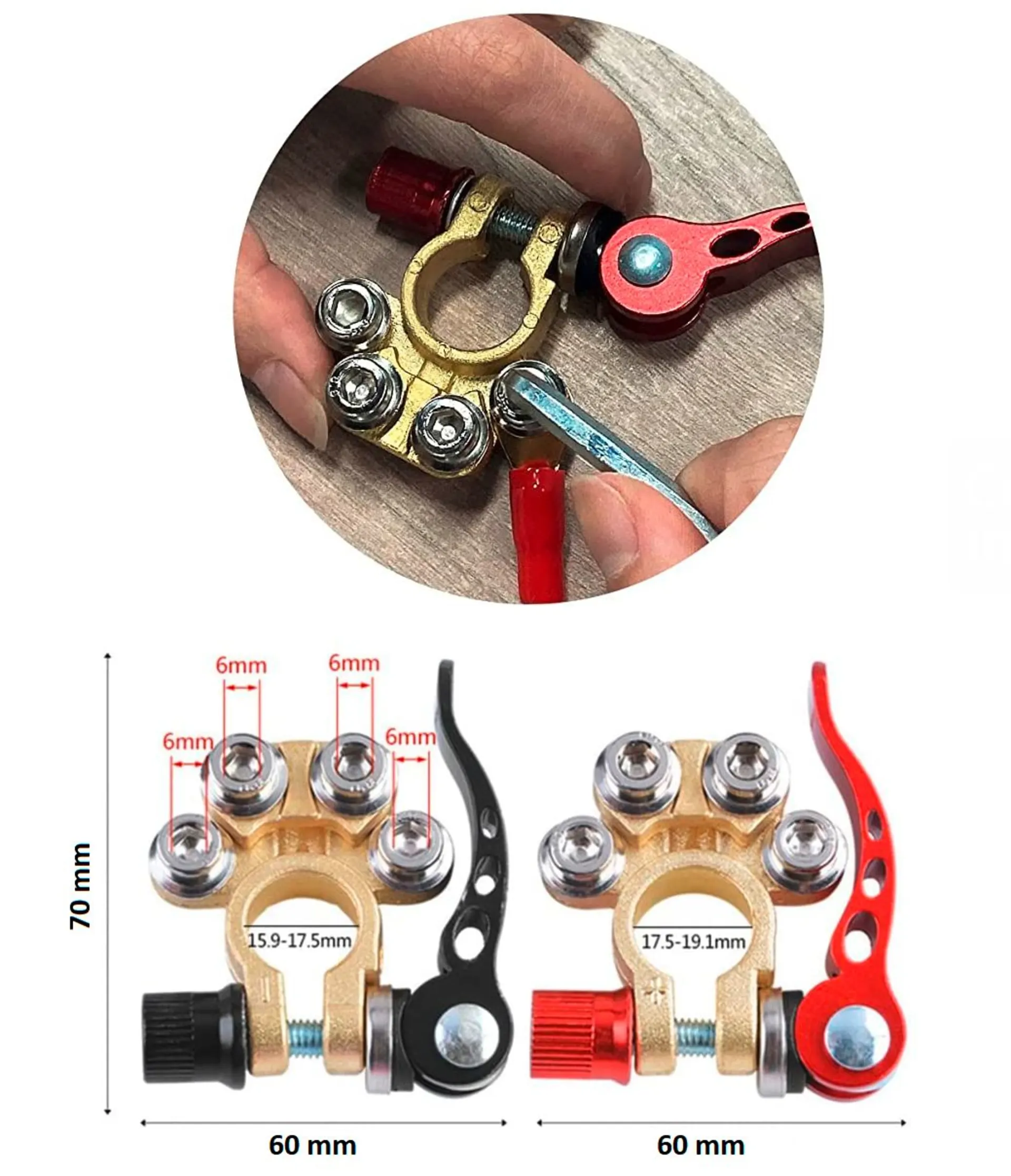Dieses Batterie-Polklemmen-Set ermöglicht den sicheren Anschluss von bis zu drei Leitungen pro Polklemme. Dank der Schnellspanner ist die Montage einfach und schnell erledigt. Die farbcodierten Klemmen in rot (Plus) und schwarz (Minus) sorgen für eine klare Zuordnung.