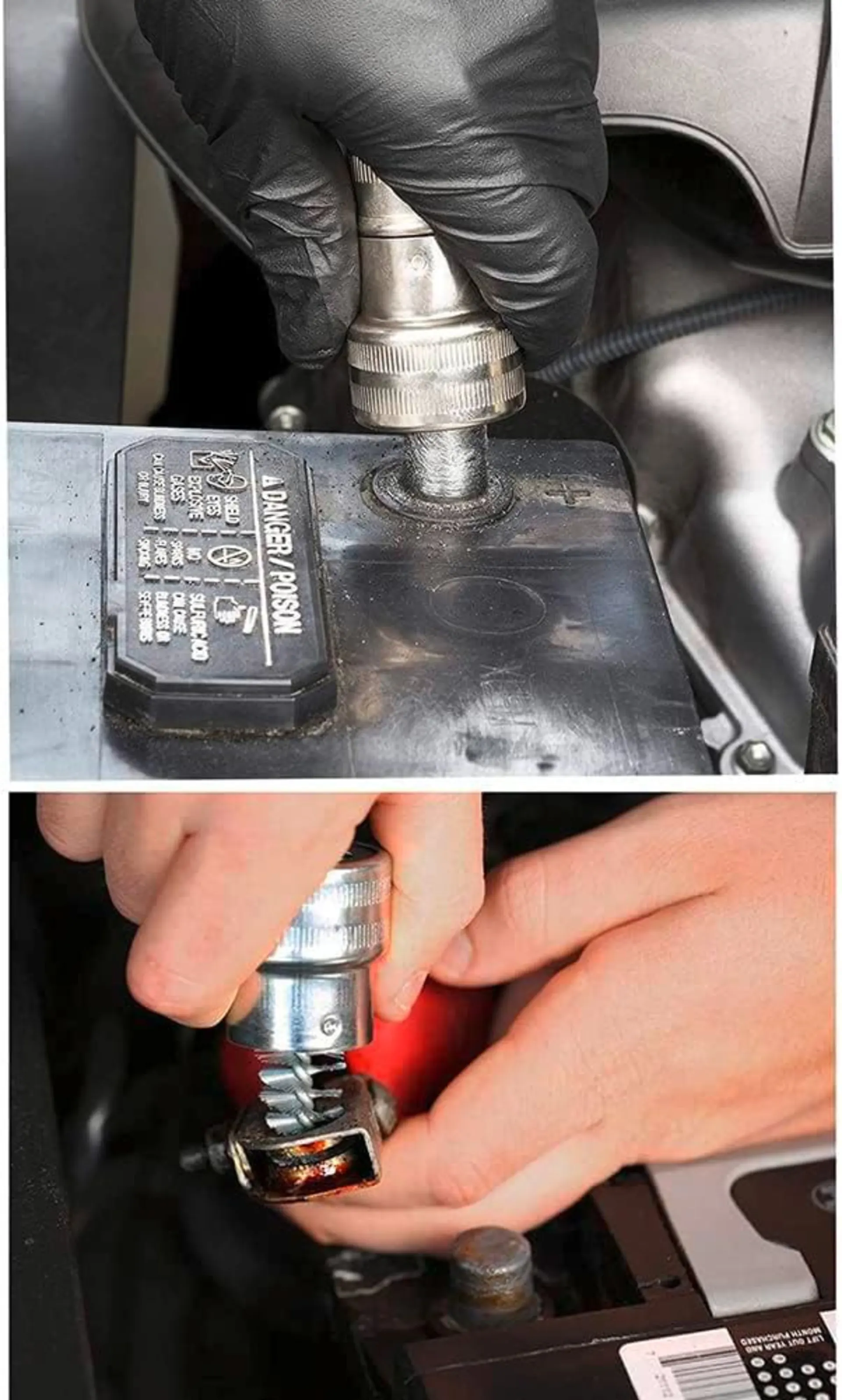 Mit der Batteriepol-Reinigungsbürste reinigen Sie Batteriepole schnell und einfach, um eine optimale Leitfähigkeit und besseren Kontakt zu gewährleisten. Die Stahldrahtbürste entfernt Verschmutzungen an positiven und negativen Batterieklemmen, sowohl innen als auch außen. Die farbcodierten Unterlegscheiben verhindern Schäden an den Klemmen, verlängern die Batterielebensdauer und sind für 6- und 12-Volt-Batterien geeignet.