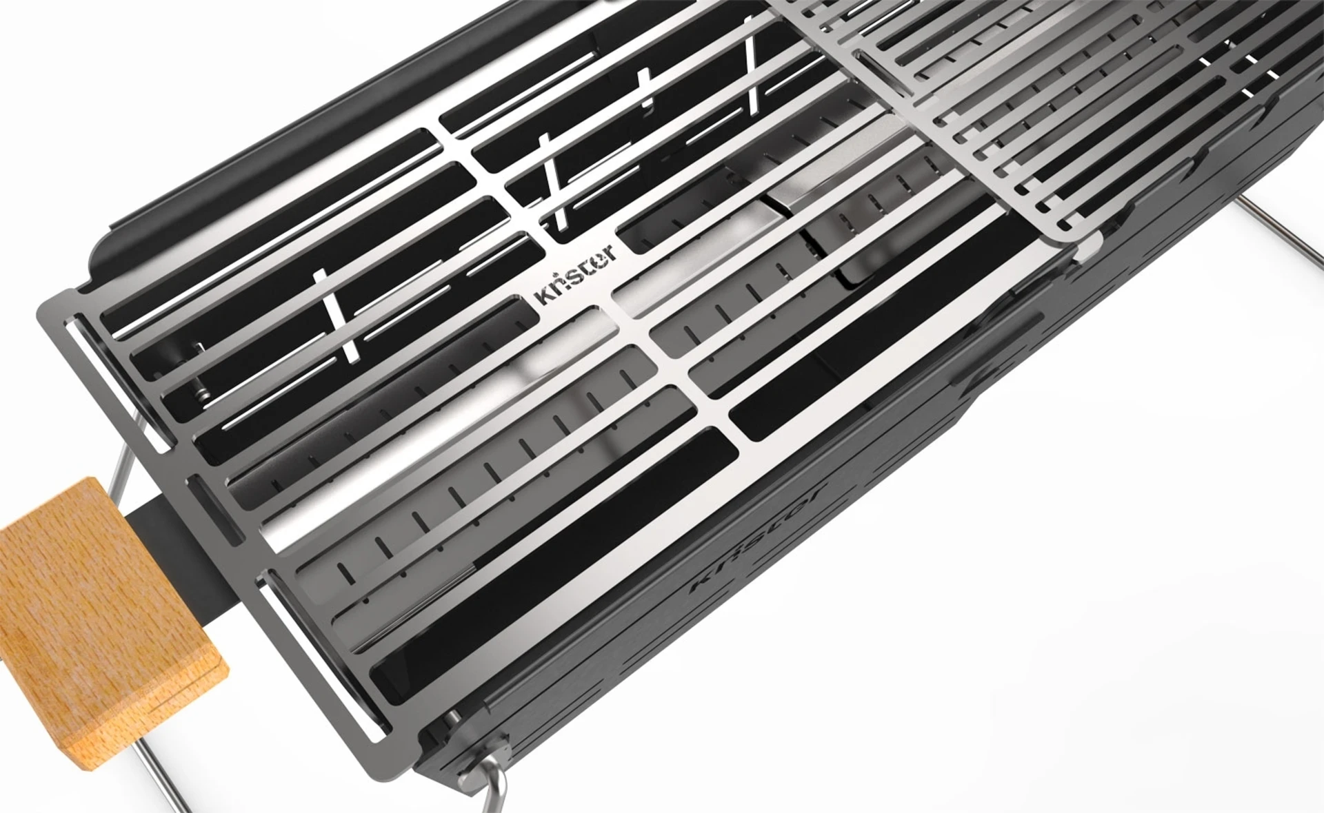 Diese Innovation ist sofort einsatzfähig und muss nicht aufgebaut werden. Brennrohr und Abstrahlbleche werden automatisch mit ausgezogen, wenn der Grill auseinandergeschoben wird. Höhenverstellbare 2-Zonen Roste fur Fleisch und Gemuse bieten eine uberdurchschnittlich große Grillfläche. Die optimale Temperatur ist bereits nach 2 Minuten erreicht. Bei Bedarf kann die Brenneinheit herausgenommen werden um mit Holz oder Kohle zu grillen.