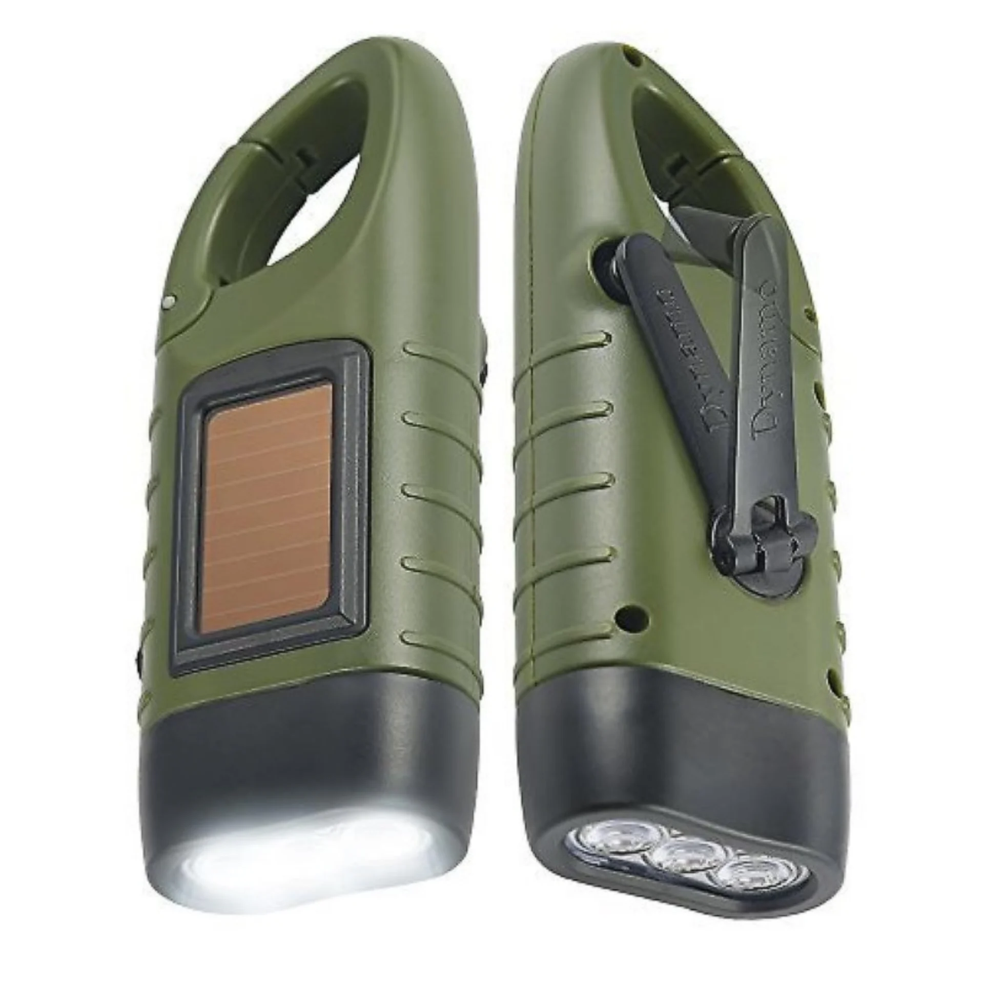 - Wiederaufladen durch Kurbel oder Solarpanel