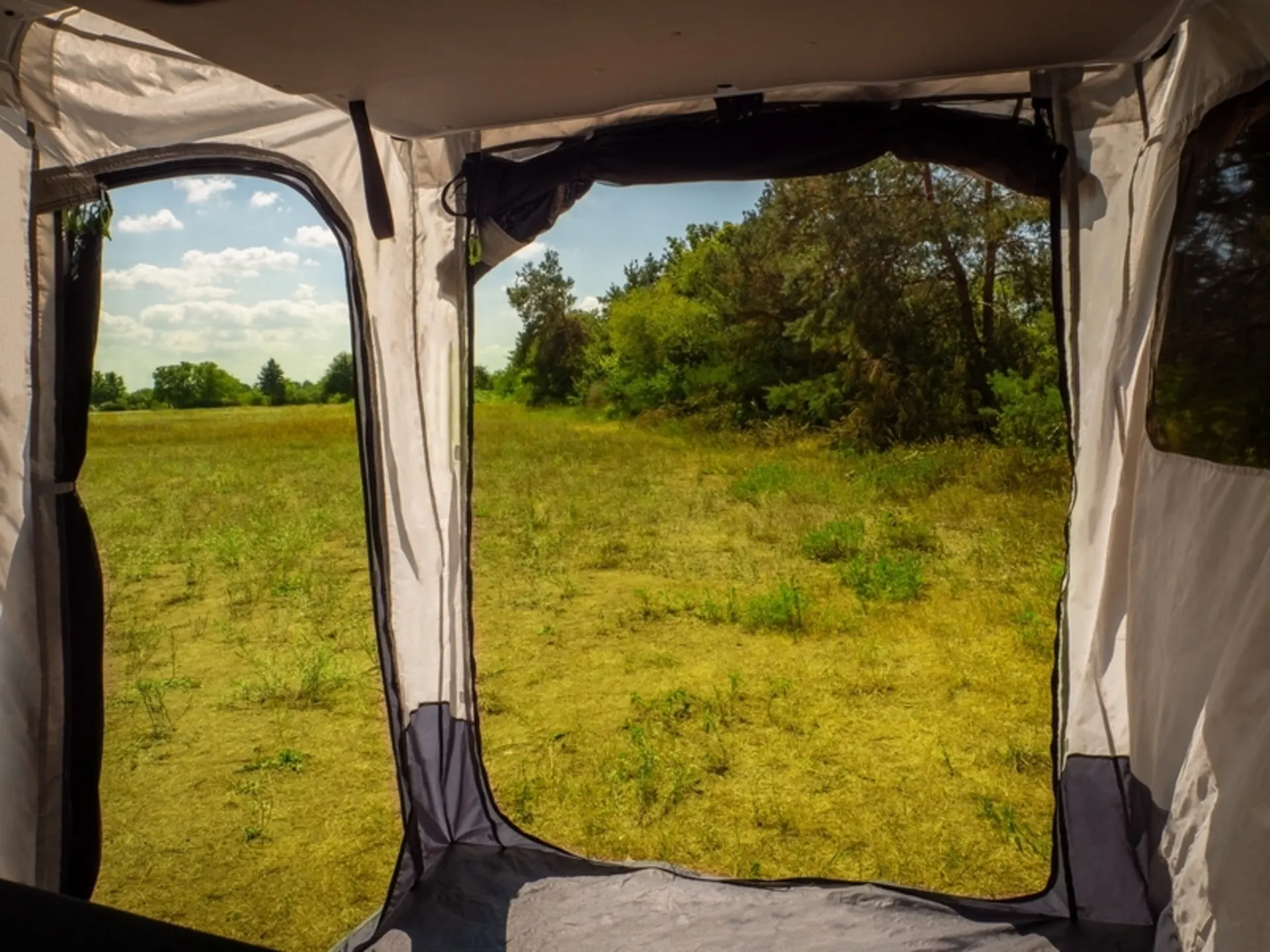 Le grand espace intérieur convient pour un lit de camp, des vélos, comme espace pour les chiens, etc. et peut également être utilisé comme vestiaire ou tente de douche. Il suffit de tirer la tente arrière par-dessus le hayon ouvert et de la fixer ensuite au véhicule et au sol.