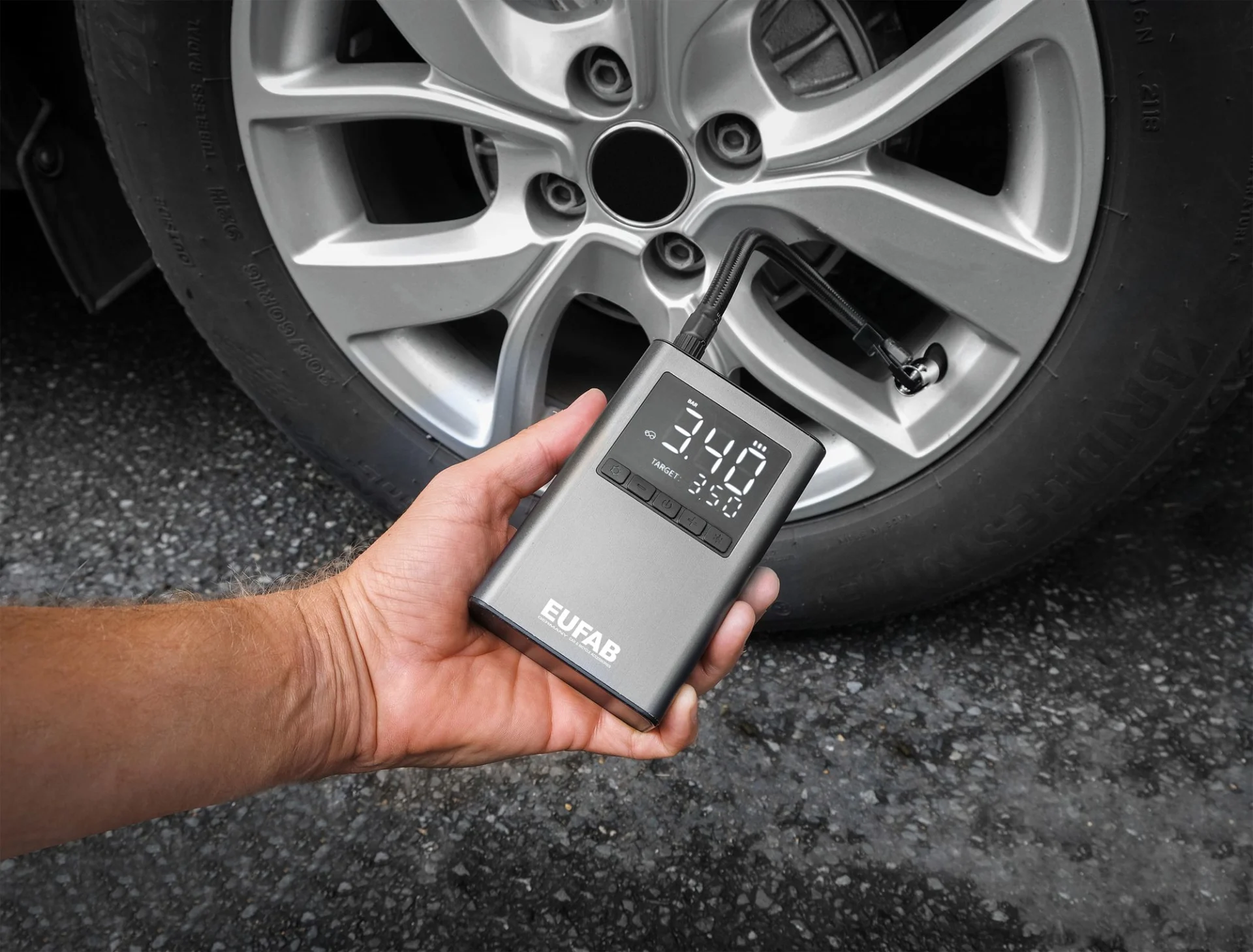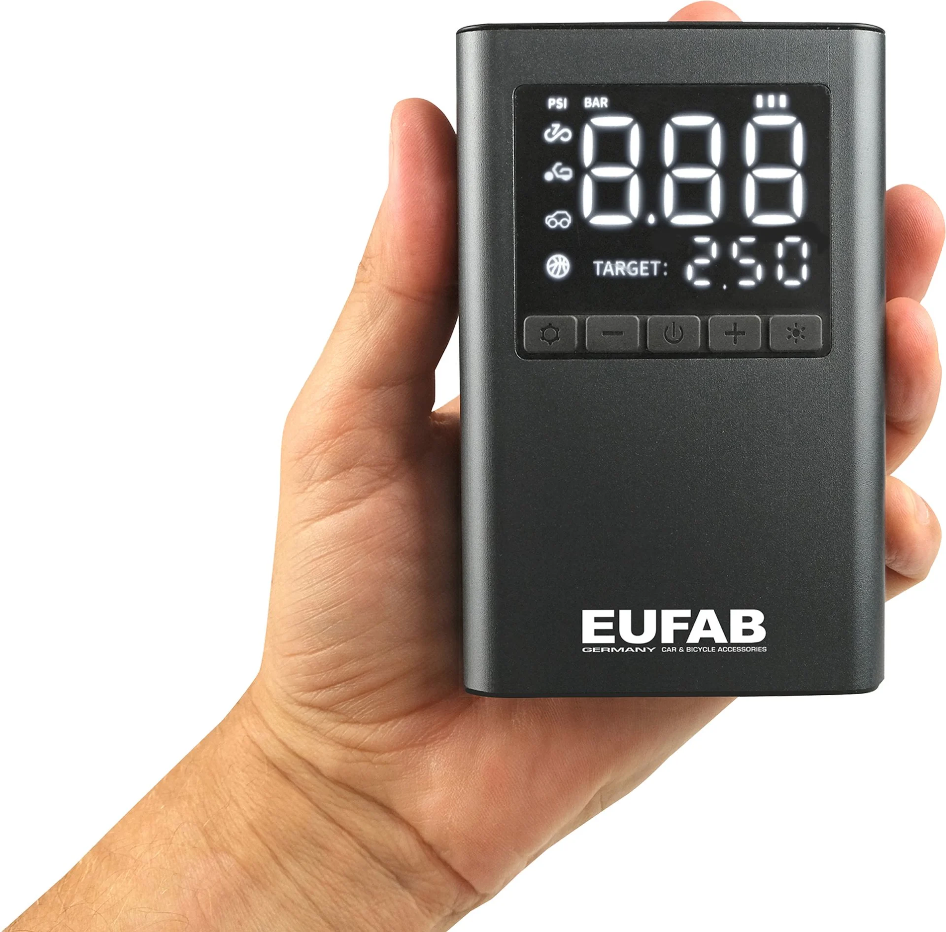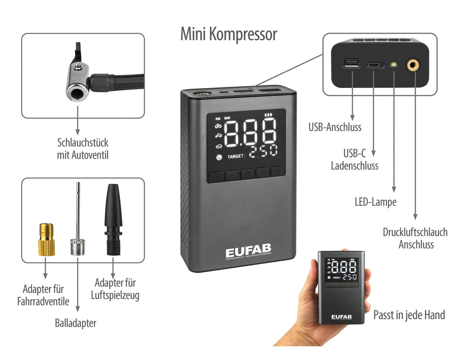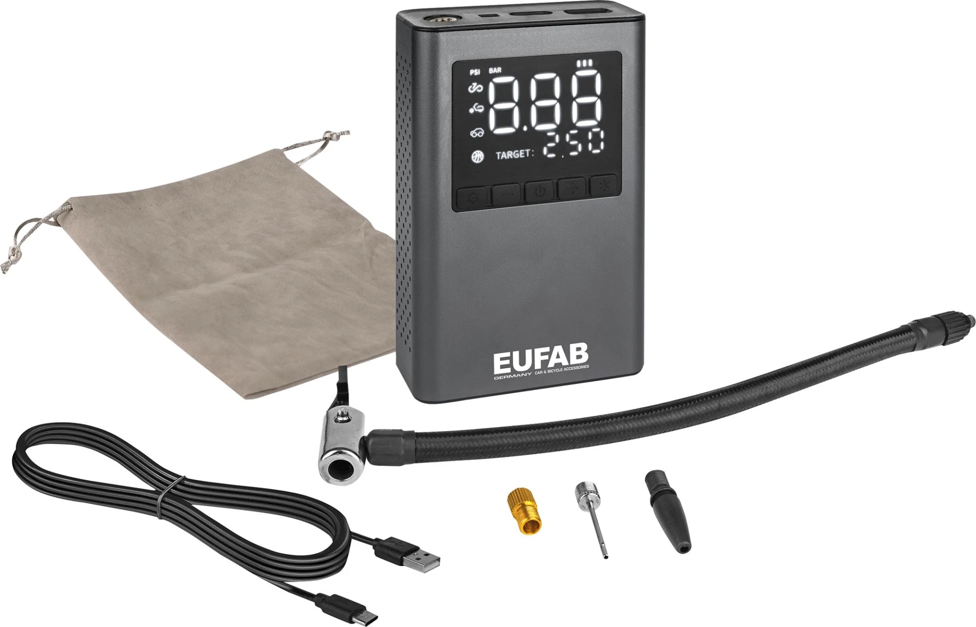 Il peut être utilisé comme banque d'énergie pour recharger les téléphones portables par exemple. La pression souhaitée peut être réglée. L'appareil s'arrête automatiquement lorsqu'il est atteint. Avec un sac de transport pratique.