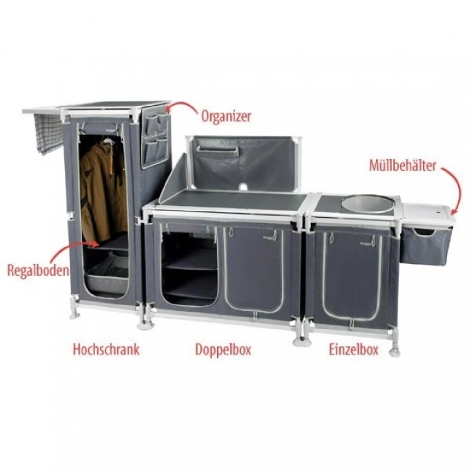 L'armoire ModuCamp est parfaite pour ranger les vêtements et les chaussures, elle fait partie d'un système modulaire d'auvent. Peut être combiné avec d'autres modules pour former un aménagement complet de l'auvent.Peut être ajouté : 1 armoire de cuisine (art. n° 92590), 1 cuisine de camping Single (art. n° 92588),très pratique : une autre étagère pour l'armoire (art. n° 92594), un ustensilo ilo (art. n° 92595). Pour relier les modules, utilise : raccord d'armoire n° 92593.