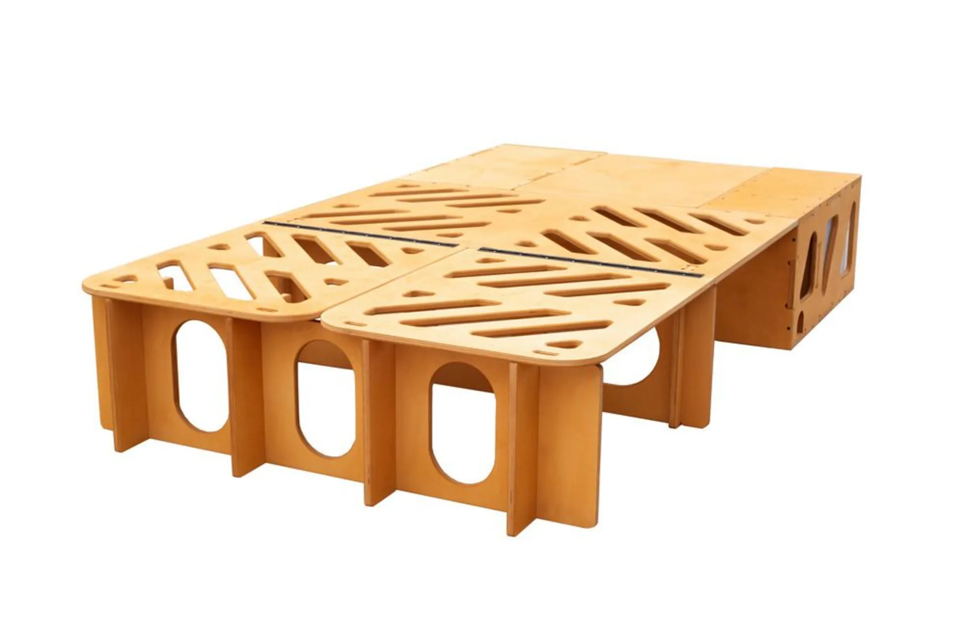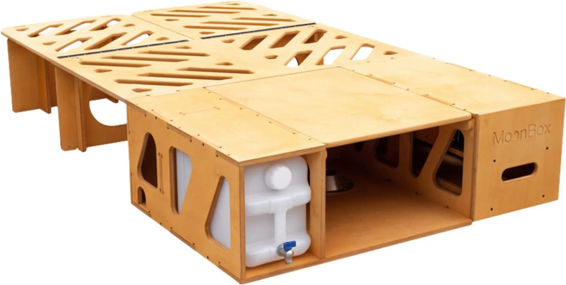Verwandle dein Fahrzeug in weniger als einer Minute in einen vollwertigen Mini-Camper – jederzeit und überall. Die Moonbox lässt sich während der Fahrt platzsparend zusammenklappen und wird am Zielort wahlweise zu einem bequemen Doppelbett oder einer Lounge mit Tisch, Wasserspeicher und voll ausgestatteter Küche. Sie ist sofort einsatzbereit und komplett aus natürlichem Birkenholz gefertigt – ohne Plastik. Schrauben und Befestigungen bestehen aus Metall.