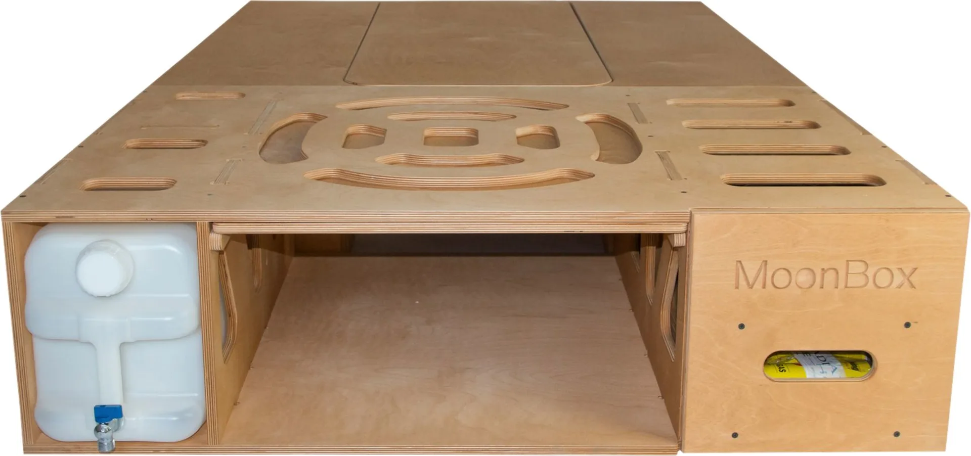 Unser Moonbox-Camping-System ist eine Box aus Birkenholz, welche im Kofferraum des Fahrzeugs gelagert wird.