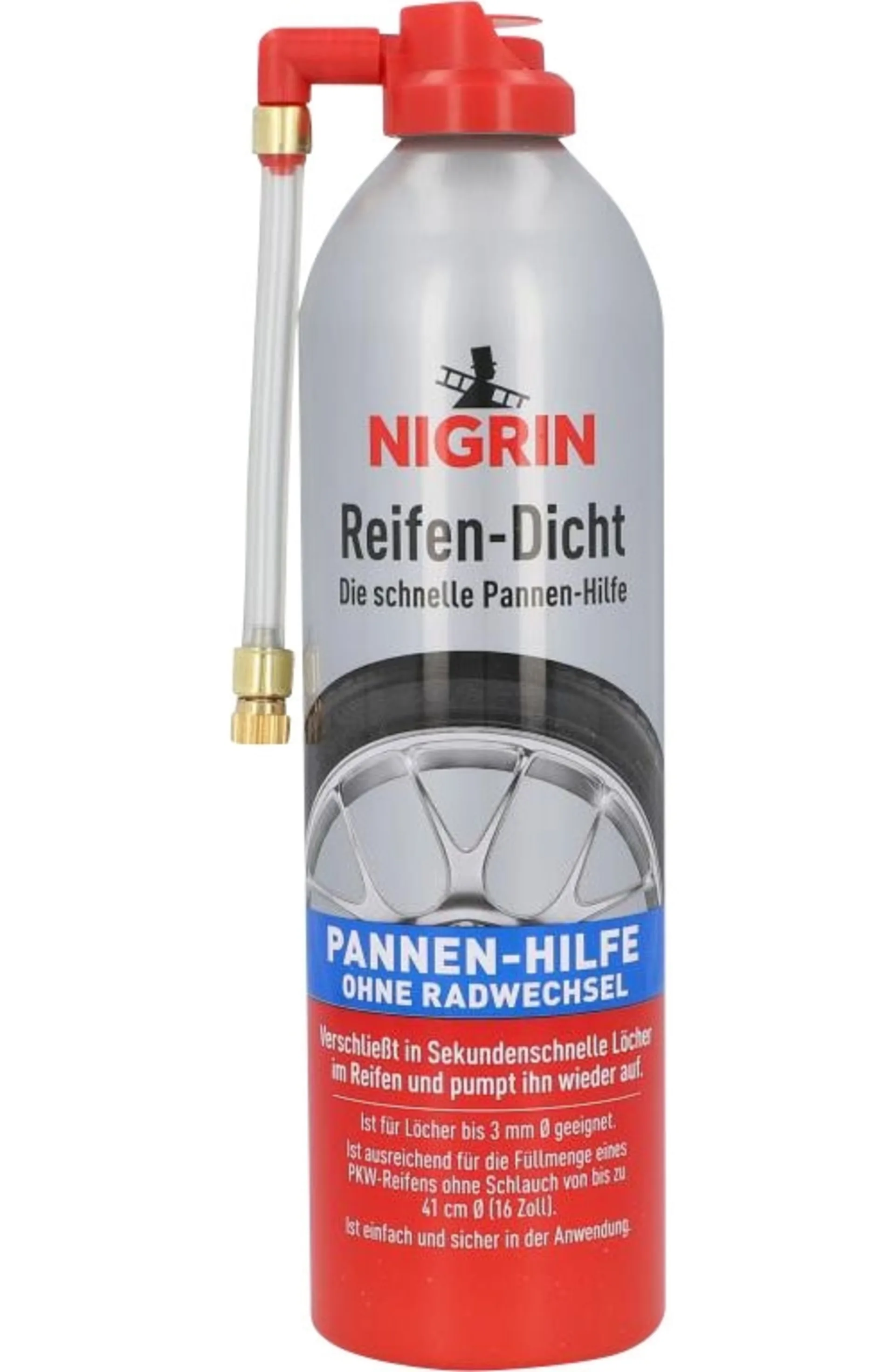 La quantité de remplissage de 500 ml du spray Nigrin est suffisante pour un pneu de voiture (sans chambre à air) jusqu'à environ 16 pouces.
