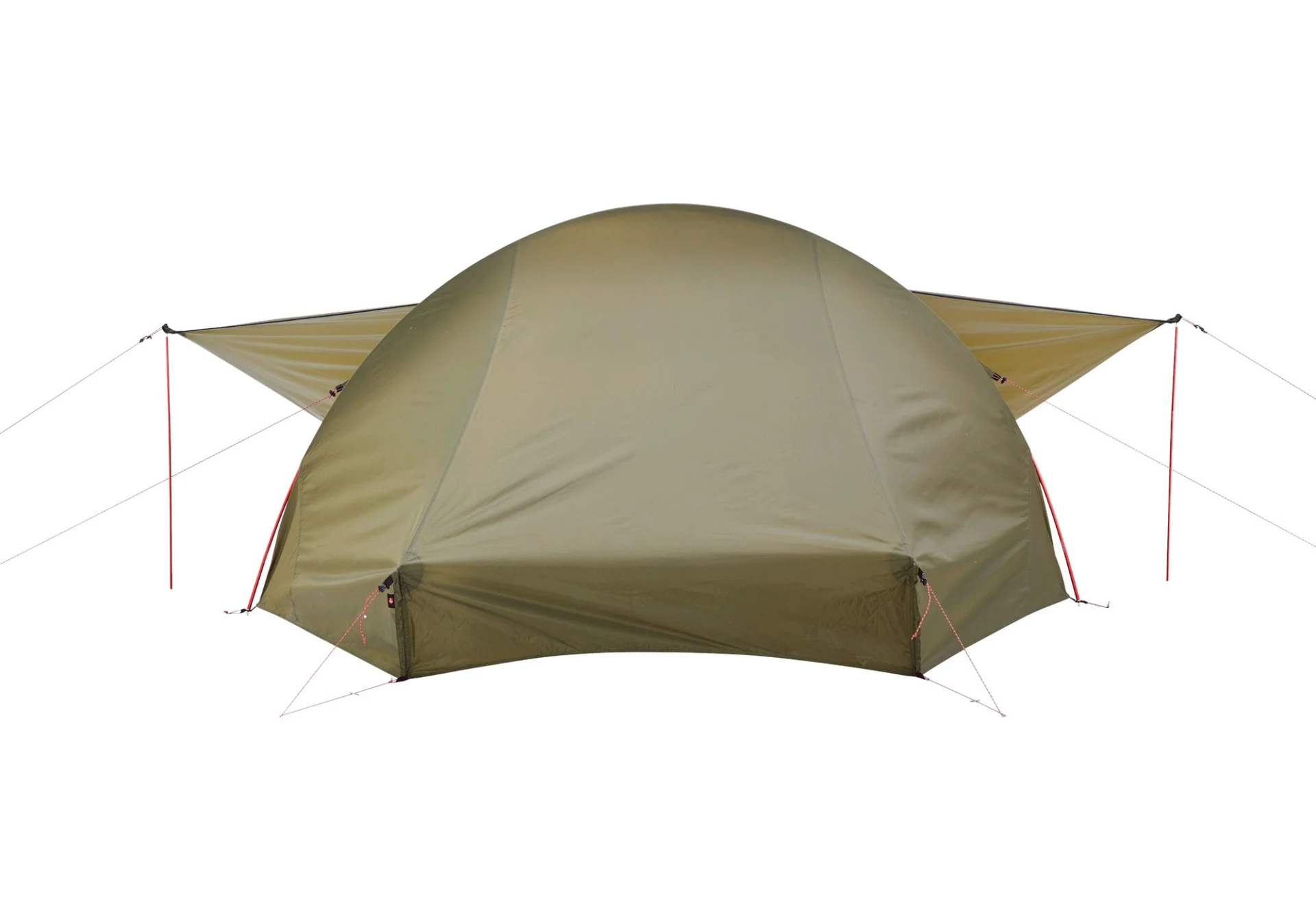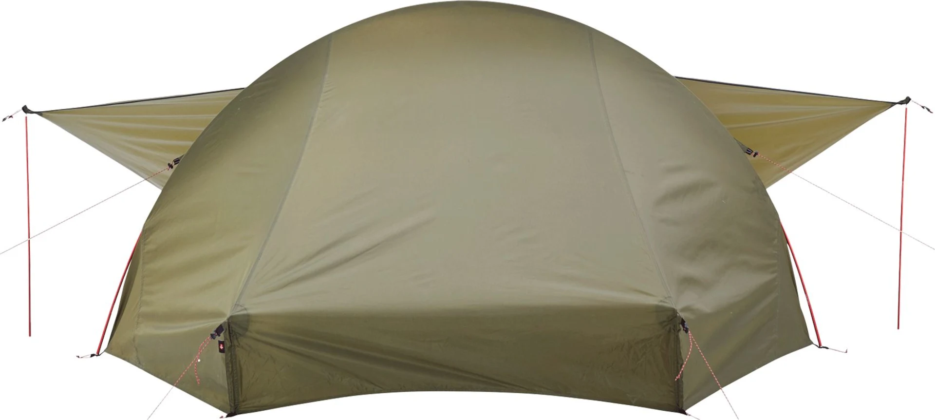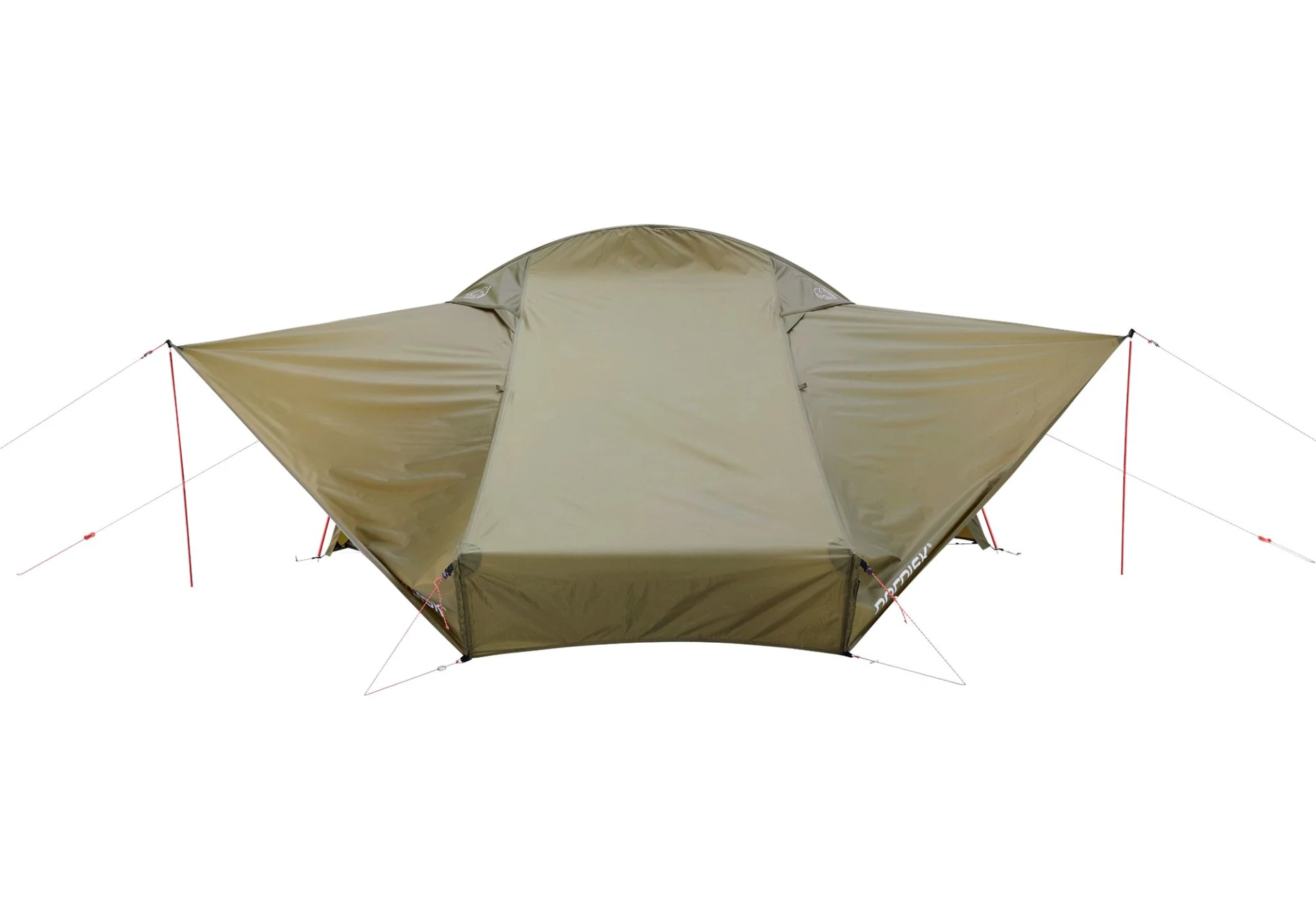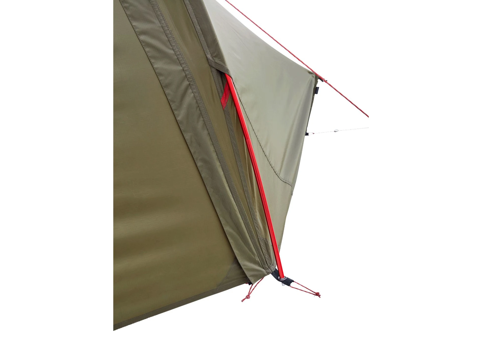 Abgesehen davon, haben wir alle großartigen Eigenschaften des klassischen Nordisk Telemark beibehalten: Er ist hervorragend belüftet, verfügt über leicht verstellbare Abspannseile, einen magnetischen Schnellverschluss, Innentaschen zur Aufbewahrung und vier eingenähte Stangen in den Ecken. Außerdem besteht die Möglichkeit, die beiden Außentüren mithilfe der zwei zusätzlichen Ministangen und des mitgelieferten zusätzlichen Abspannseils in einen geschützten Kochbereich umzuwandeln.