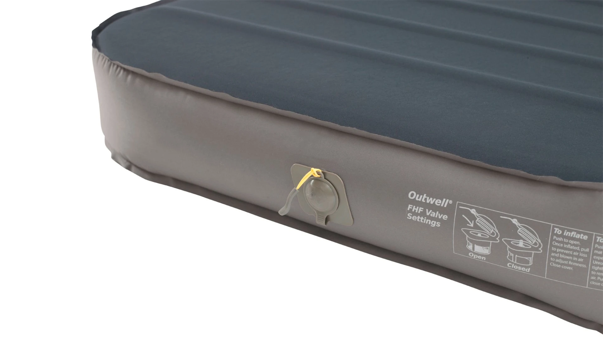 La gamme Dreamboat comprend des matelas de couchage en version simple ou double avec différentes épaisseurs. Ils sont équipés de la valve Outwell® FHF (Flat High-Flow Valve) - une valve plate qui permet un flux d'air élevé aussi bien lors du gonflage que du dégonflage. Les parois latérales en textile ne fléchissent pas sous la pression, ce qui rend le gonflage plus facile car il faut ajouter moins d'air.