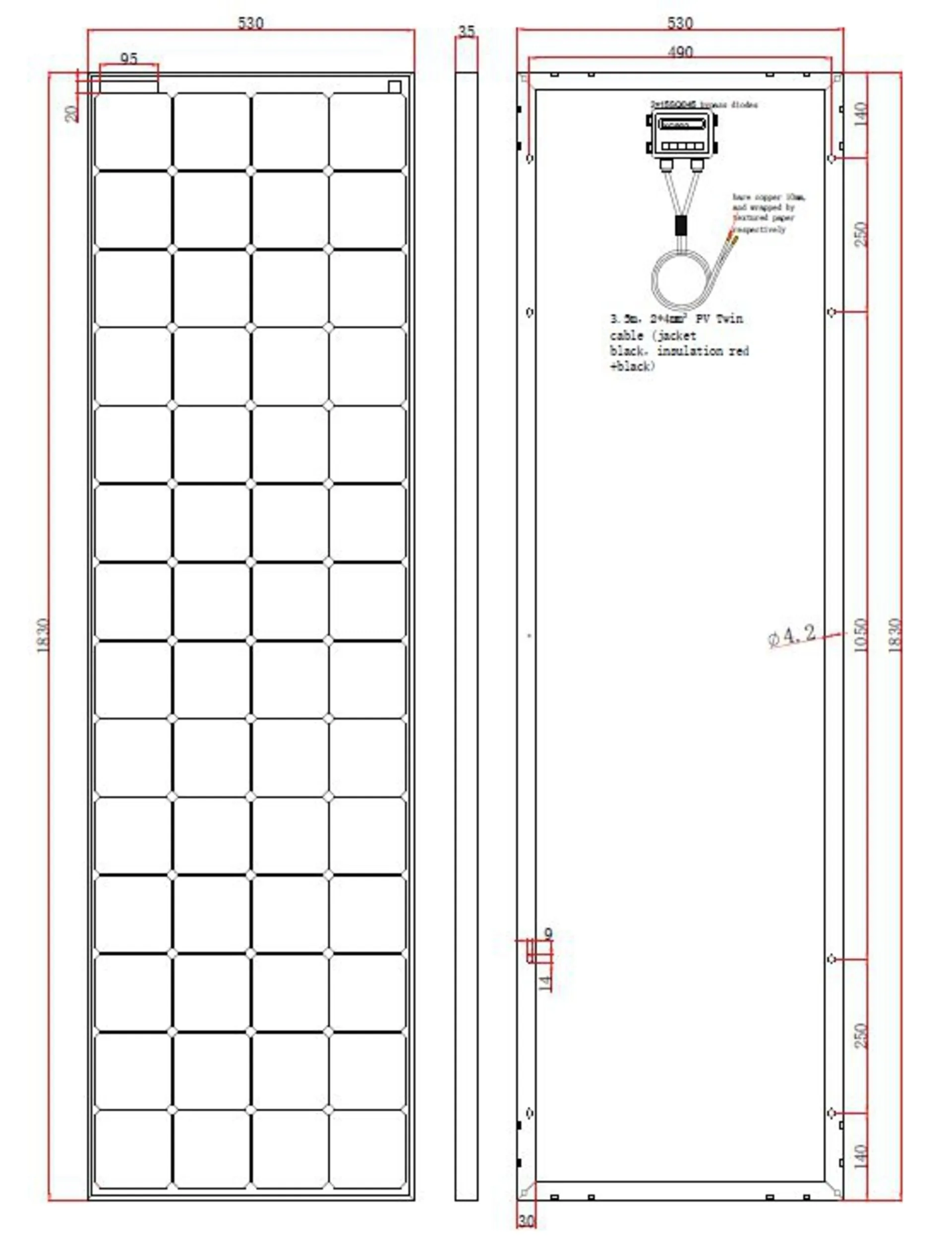 Grâce aux câbles de connexion de 3,5 m du panneau solaire, le panneau peut être directement connecté au régulateur de charge solaire sans extension supplémentaire dans la plupart des applications.