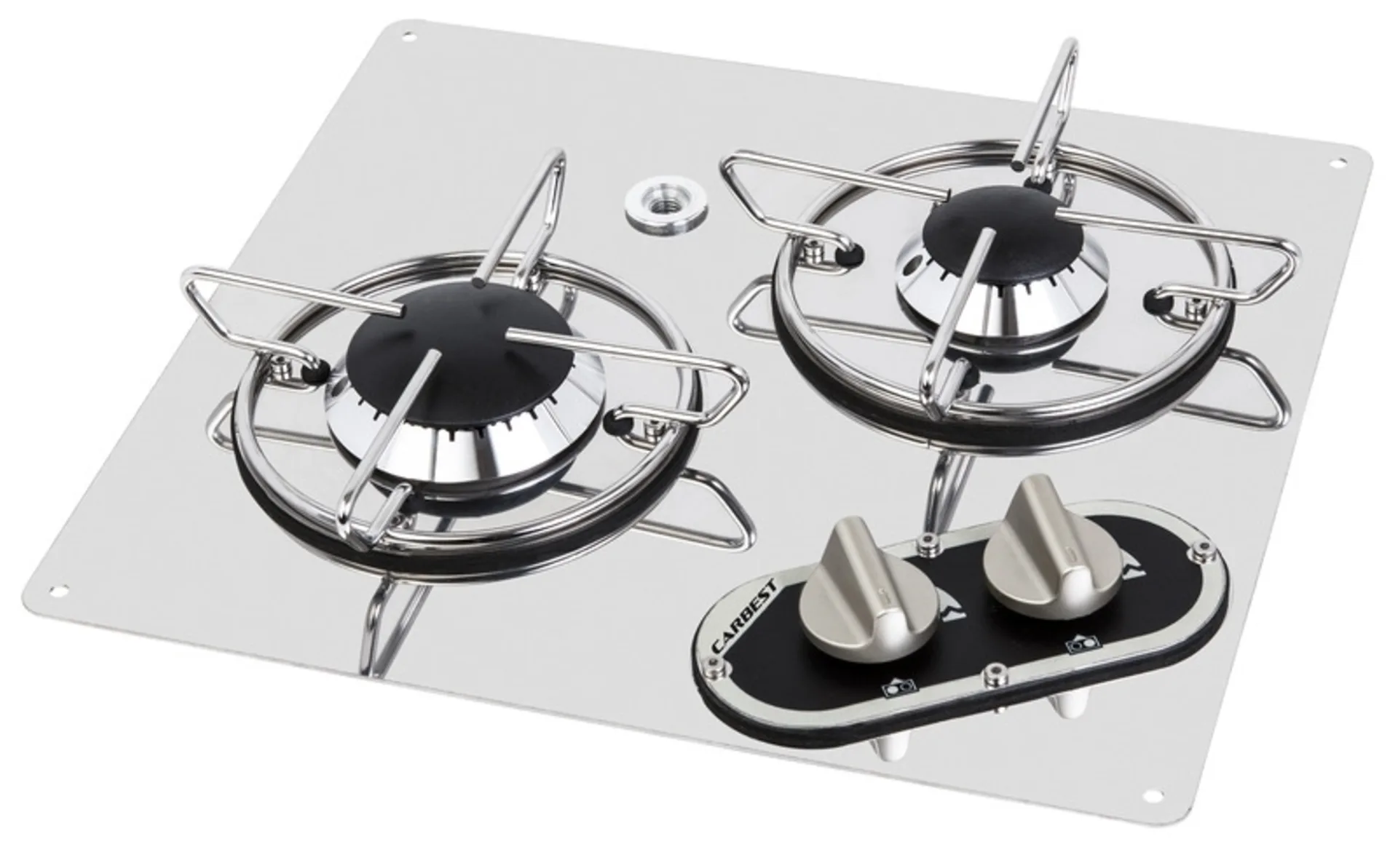 Cuisinière à gaz encastrable Carbest de haute qualité, 2 feux, avec sécurité d'allumage et allumage manuel. Commandes en bas, 2 feux, allumage manuel, puissance : 1x 1,8 kW, 1x 1,0 kW, consommation de gaz 204 g/h, 30 mbar, poids : 2,5 kg.