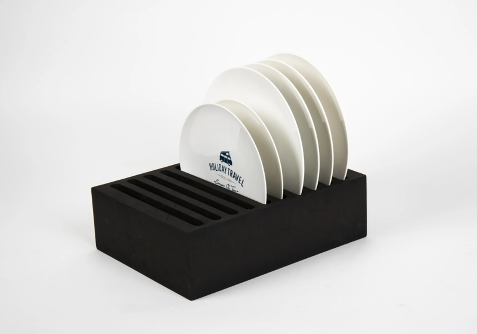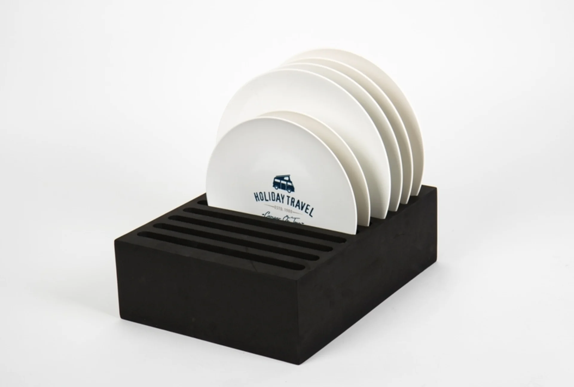 Le support d'assiettes en mousse (EVA) réduit le cliquetis des assiettes pendant la conduite. Convient aux assiettes jusqu'à Ø 23 x H1,5 cm. Dimensions : 33 x 25 x 10 cm.
