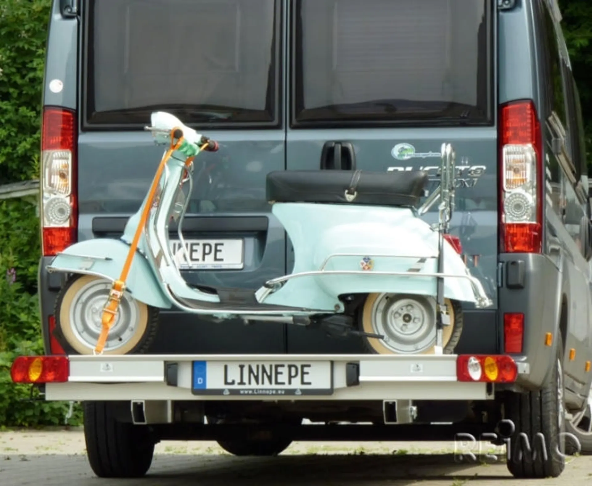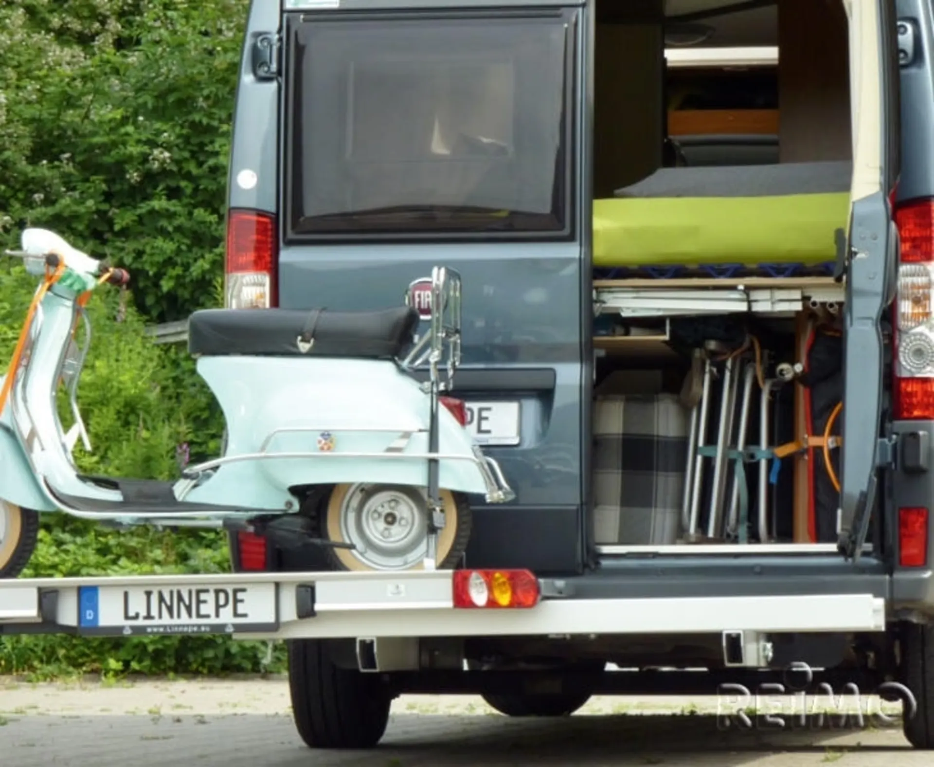 Le support idéal pour le fourgon Fiat. La plateforme peut être déplacée sur le côté. L'accès à la porte arrière droite est ainsi libre. Le deux-roues est maintenu en toute sécurité grâce à la sangle de guidon et aux sangles supplémentaires - sans aucun étrier de maintien. Démontage rapide du support grâce à une fixation rapide sans outils. Avec homologation CE - pas d'inscription sur les papiers du véhicule.