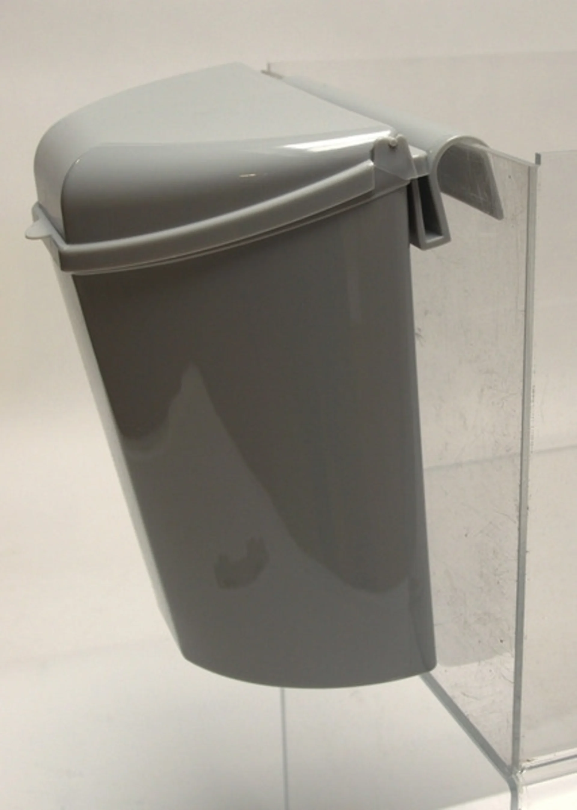Poubelle avec couvercle. Comprend 2 rails d'accrochage : 1 rail pour un montage fixe, par exemple sur un mur ou une porte de camping-car, et 1 rail à accrocher, par exemple sur une barre de véranda ou autre.