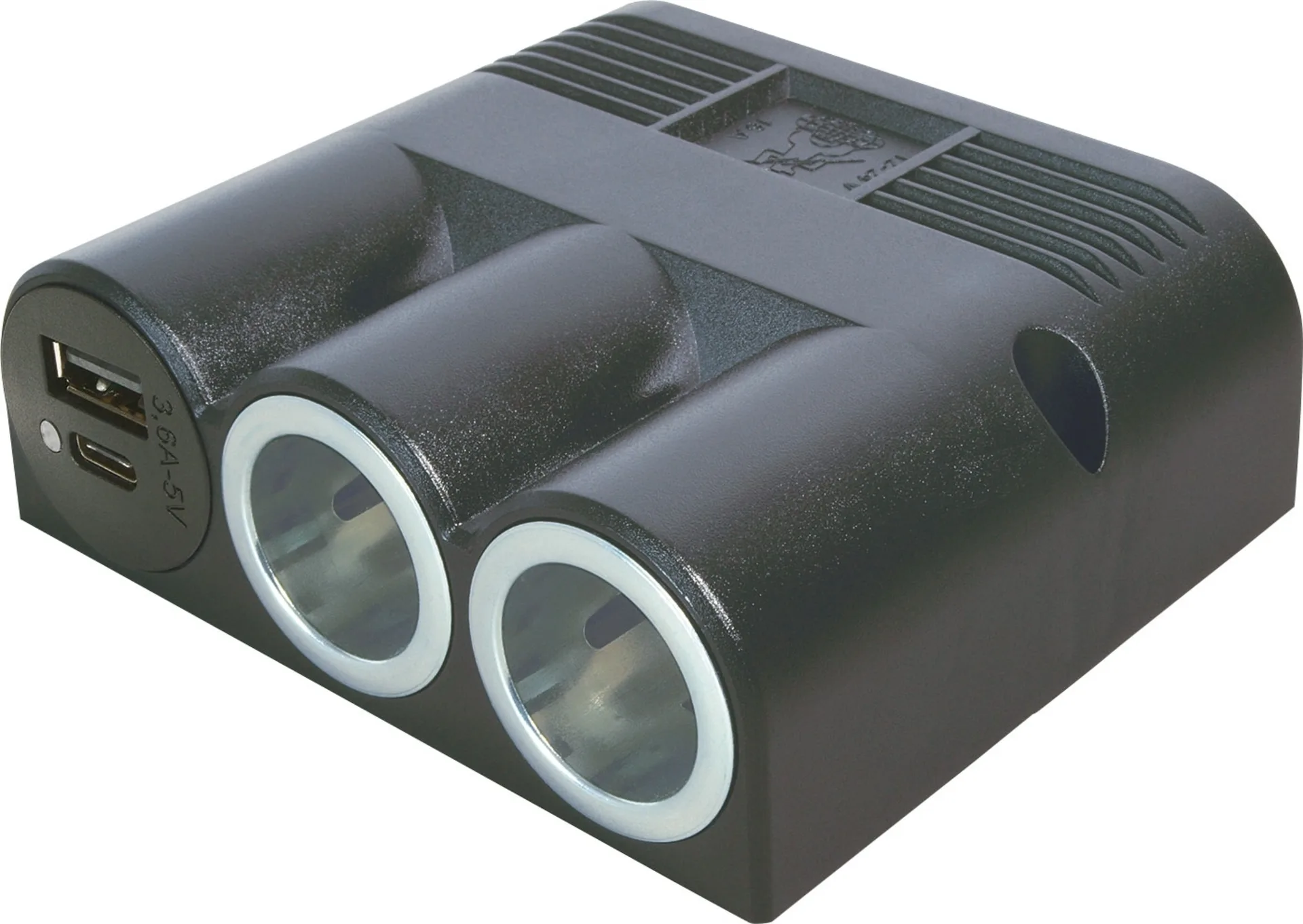 Entrée 8-34 V DC, homologation E1, consommation propre ≤ 1 mA. Connexion : 1x USB-C et 1 x USB-A Protection contre la surcharge, protection contre la surchauffe, protection contre l'inversion de polarité, protection contre les courts-circuits, protection contre les surtensions en cas de courtes pointes de tension 2 prises de courant 12-24 volts (Ø intérieur 21 mm) pour alimenter les appareils qui peuvent être utilisés avec 12-24 volts. Capacité de charge max. 20 A pour une section de câble d'alimentation de 2,5 mm2, max. 16 A pour une section de câble d'alimentation de 1,5 mm2. Fixation à l'aide des vis fournies. Raccordement de câble pré-confectionné