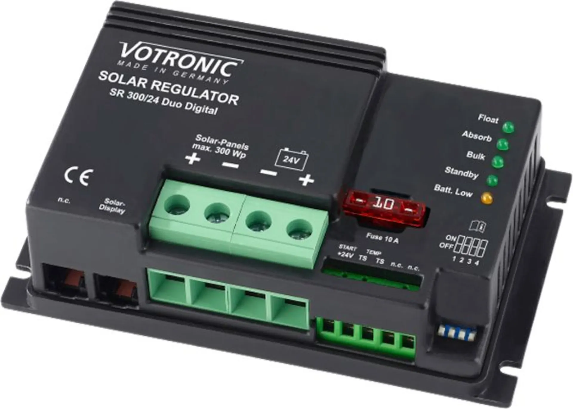 - Bordnetzfilter: Eingebaut, erlaubt den problemlosen Parallelbetrieb des Reglers mit anderen Ladequellen, Wind- und Benzingeneratoren, Netz-Ladegeräten, Lichtmaschinen etc. an einer Batterie.