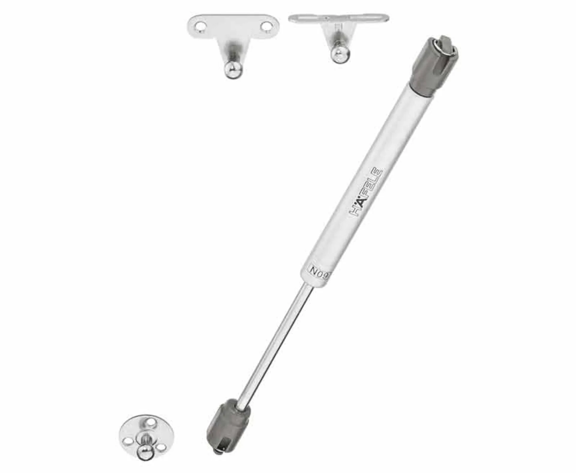 Ressort à gaz, pour abattants en bois ou avec cadre en aluminium. Acier nickelé, force du ressort 100 N.