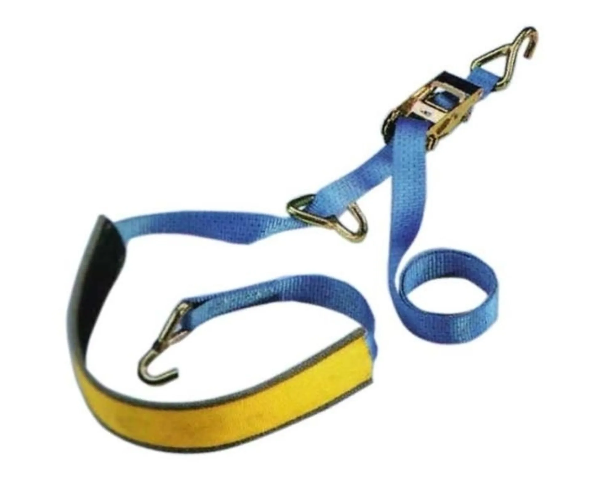 Sangle à cliquet pour charges lourdes avec griffes en acier et fixation spéciale pour roues de voiture. Résistance jusqu'à 2000 daN. La résistance à la traction daN (décanewton ou 10 newtons) est une unité utilisée, par exemple, dans les techniques de levage ainsi que dans l'arrimage des charges pour indiquer la capacité de charge ou la résistance à la rupture des cordes ou des sangles (DIN 61360 Utilisation sûre des élingues. 100 daN=environ 102 kg).