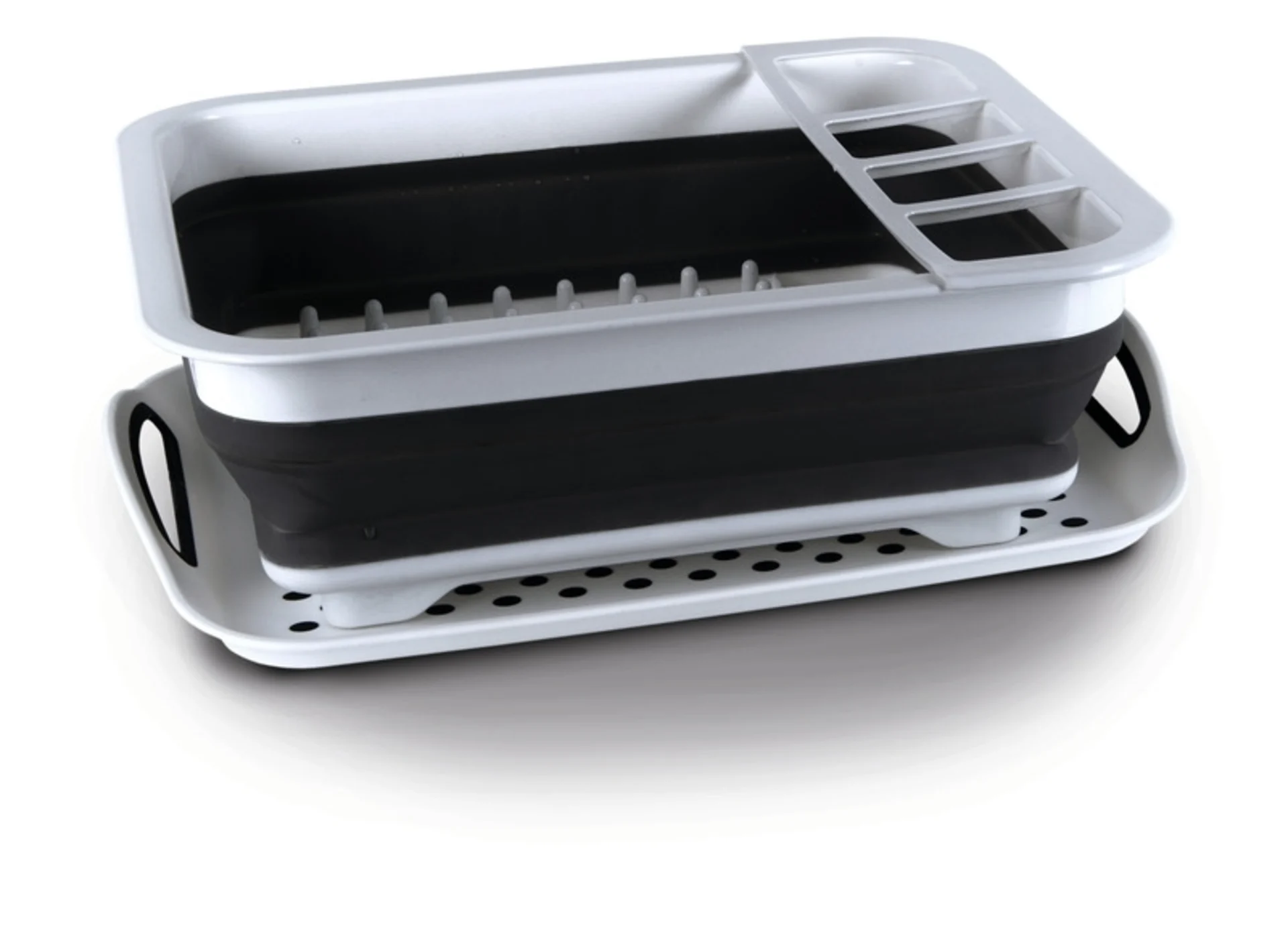 Séchoir à vaisselle pliable en silicone. Avec logement pour les couverts et les assiettes, les tasses, les petits bols et autres ustensiles. Plié, le séchoir à vaisselle peut être rangé en prenant peu de place. L'égouttoir caoutchouté et antidérapant peut également être utilisé comme plateau.