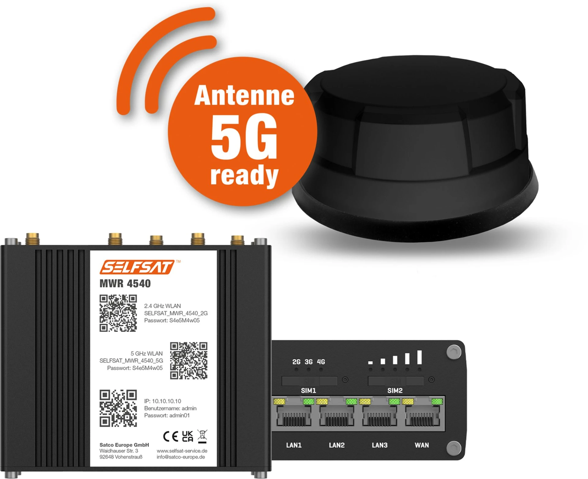 Der Selfsat MWR 4540 Router ermöglicht eine stabile Internetverbindung im Wohnmobil oder Wohnwagen, über 4G LTE und WLAN-Signale. Er verfügt über zwei SIM-Karten-Einschübe, unterstützt GPS-Ortung und ist kompatibel mit Starlink-Antennen. Durch die Verbindung zu Campingplatz-WLANs mit Anmeldeseite (Captive Portal) und die VPN-Fähigkeit, z. B. zum Streamen im Ausland, bietet der Router vielfältige Funktionen. Die Außenantenne sorgt für stabilen Empfang, auch bei abgeschirmten Fahrzeugen, und ist staub- und wasserdicht. Die Bedienung erfolgt über QR-Code oder WLAN-Namen und Passwort, eine separate App ist nicht erforderlich.