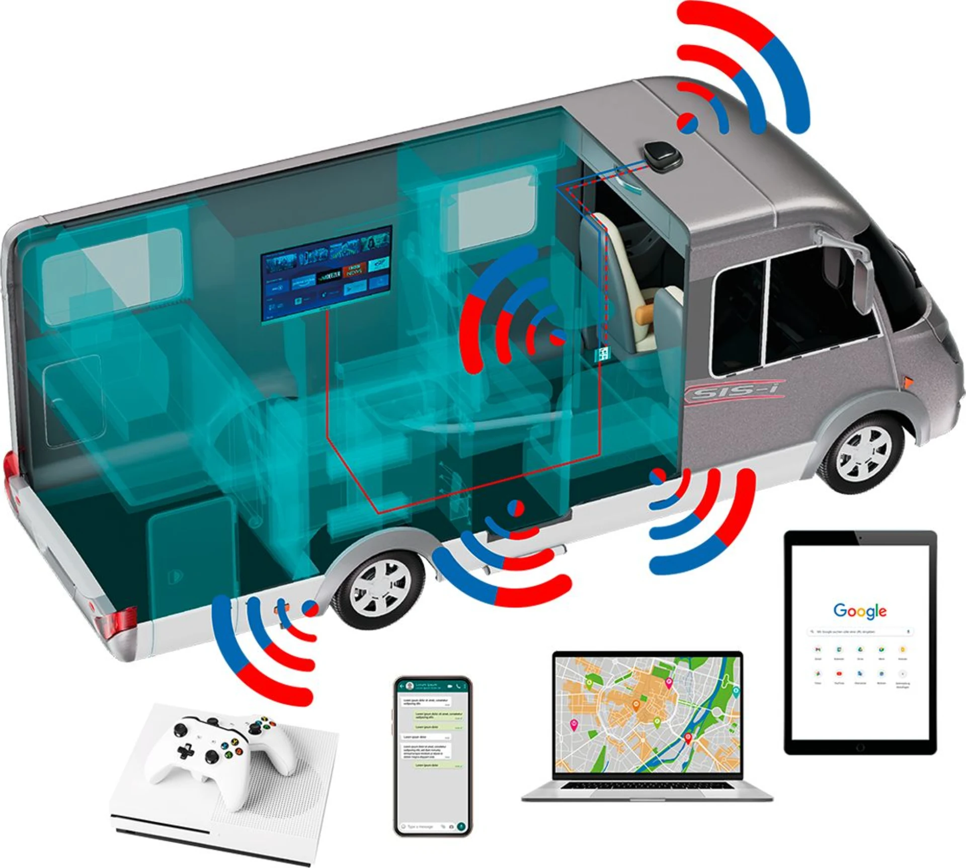Diese Router können über das 12 Volt Bordnetz betrieben werden und empfangen WLAN oder Mobilfunknetz-Signale von außen, um sie im Fahrzeug als privates WLAN auszustrahlen. Eine Außenantenne sorgt für guten Empfang und kann sowohl WLAN als auch Mobilfunknetz-Signale aufnehmen.