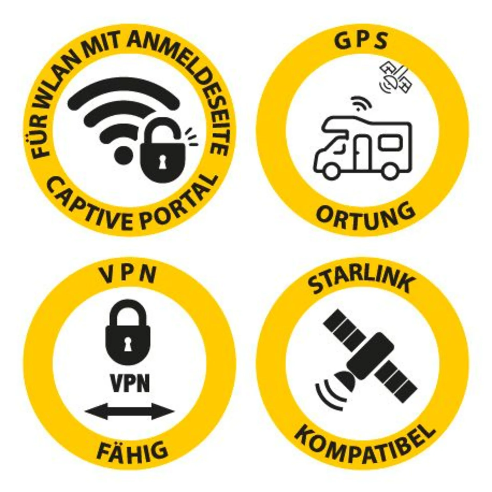 Der Router unterstützt die Anmeldung an Campingplatz-WLANs mit Anmeldeseite (Captive Portal), die GPS-Ortung des Wohnmobils, die Installation von VPNs zum Streamen im Ausland und ist Starlink kompatibel.