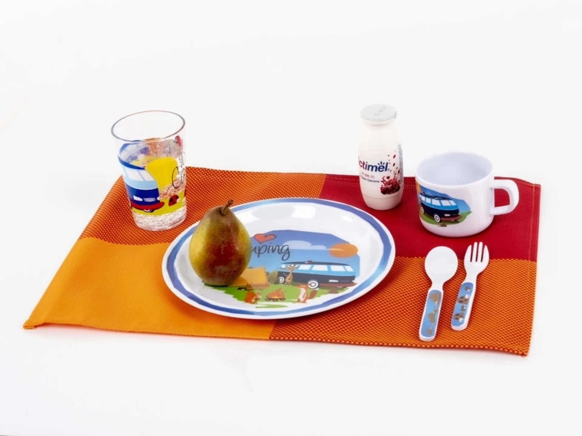 Un set de vaisselle coloré pour enfants, fidèle à la devise "WE LOVE CAMPING", composé de: