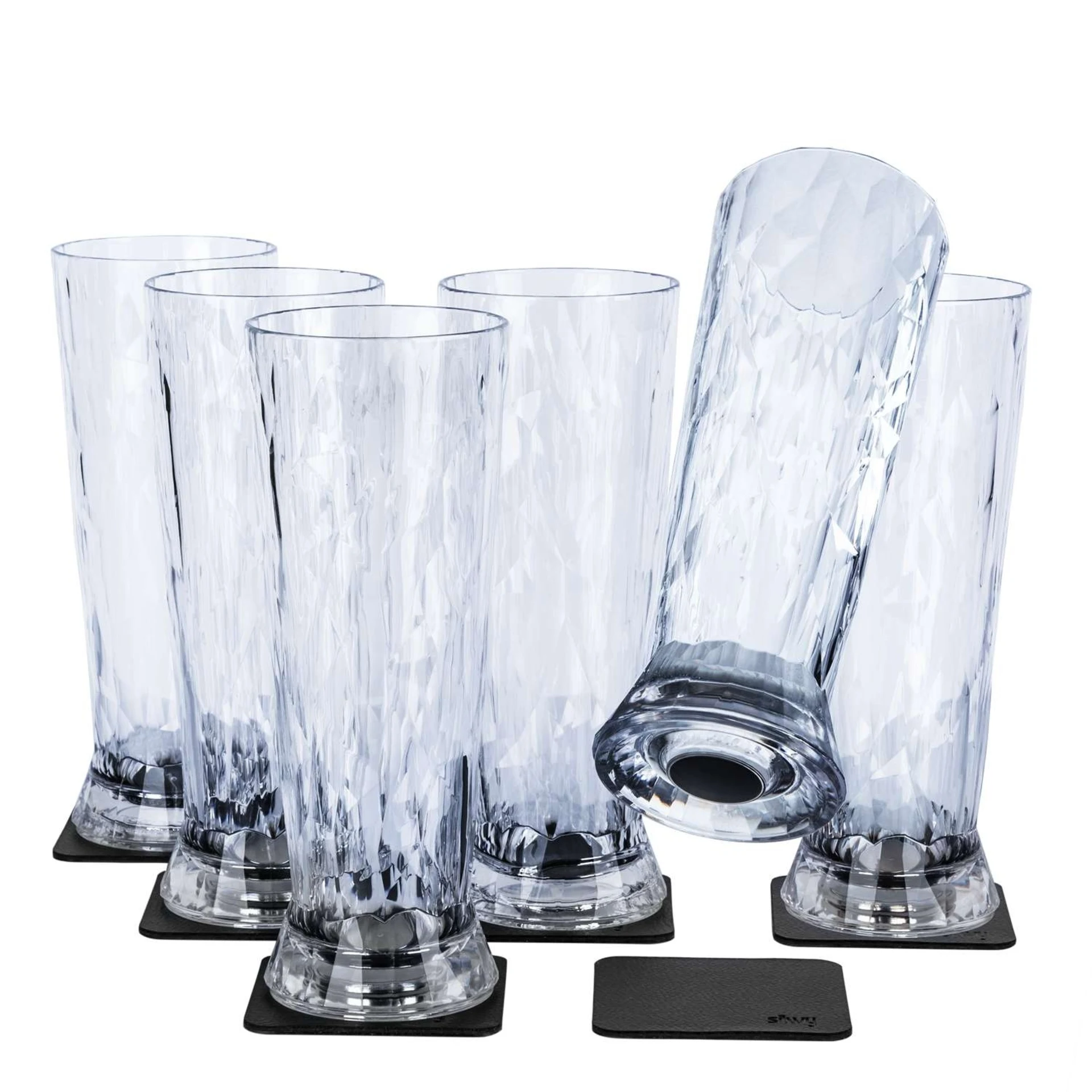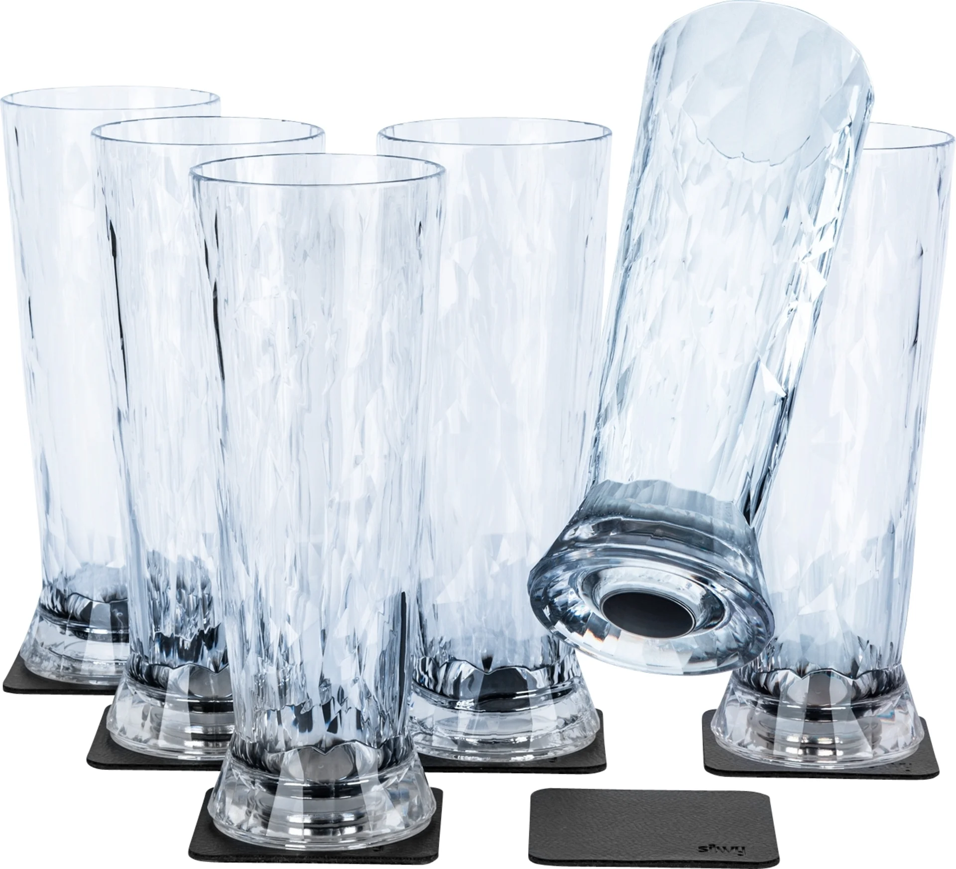 Les verres en plastique élégants, raffinés et de haute qualité abritent des aimants parfaitement intégrés dans le fond du verre et sont disponibles dans les variantes vin, champagne, bière, long drink ainsi que whisky.