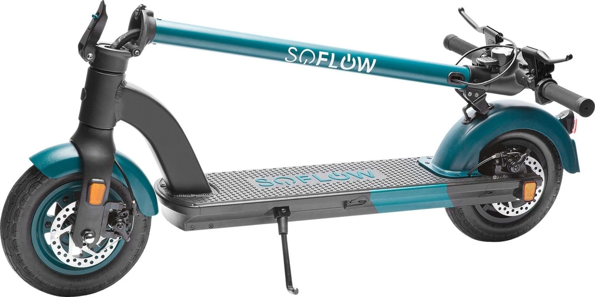 Le scooter électrique SO4 Pro de SoFlow possède une homologation routière allemande et une batterie au lithium avec une autonomie allant jusqu'à 40 km. Le moteur de 500 watts (48V) assure une accélération puissante jusqu'à 20 km/h. Il est pliable et les pneus à air assurent une conduite agréable.