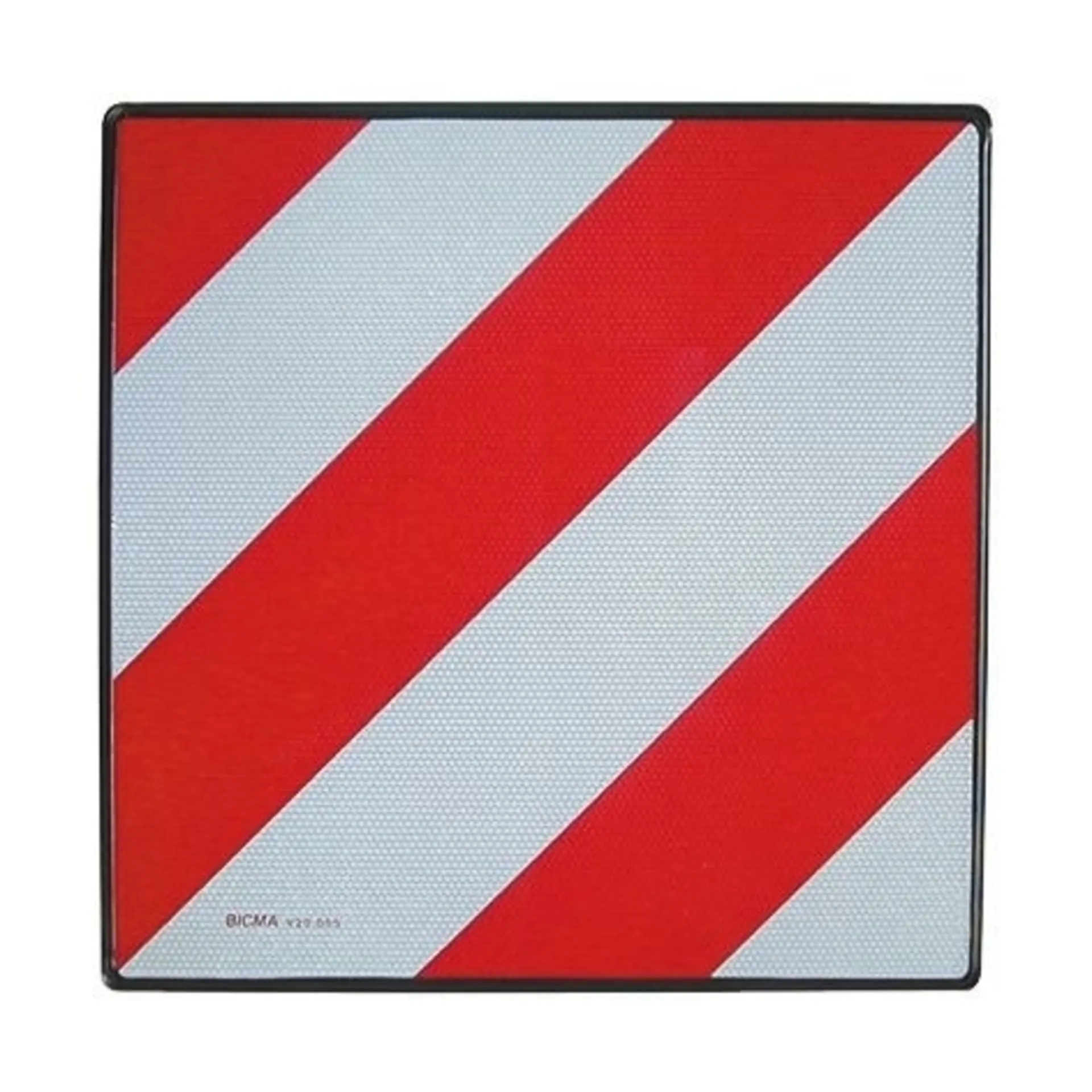 Jede überstehende Ladung muss mit einer rot-weiss schraffierten Warntafel gekennzeichnet werden. Im Unterschied zur Warntafel für Italien hat die Tafel für Spanien zusätzlich einen schwarzen Rand.
